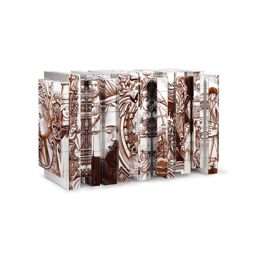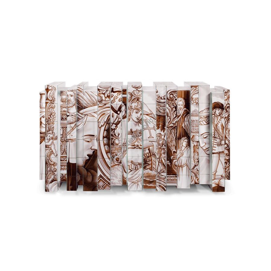 The Heritage Sideboard is a magnificent journey through Portuguese legacy. Covered in Azulejos, traditional hand painted tiles and one of the most representative art forms of Portuguese culture, the architectural sideboard portrays different scenes from the country’s Discoveries era. Centuries of history are gathered in a single final panel, and each layer is enhanced by vertical mirrors on the lateral surfaces. The hint of wander through the rich legacy continues when two door open to a lined glossy gold leaf interior, and a classical ornament trim reminds the inside of churches and rich buildings. A clear glass shelve can be seen on the two individual divisions of the sideboard. A statement sideboard, the Heritage can take center stage in the most elegant rooms since its back is also fully hand painted. A lengthy tradition of bespoke and exclusivity to make one-of-kind design pieces.