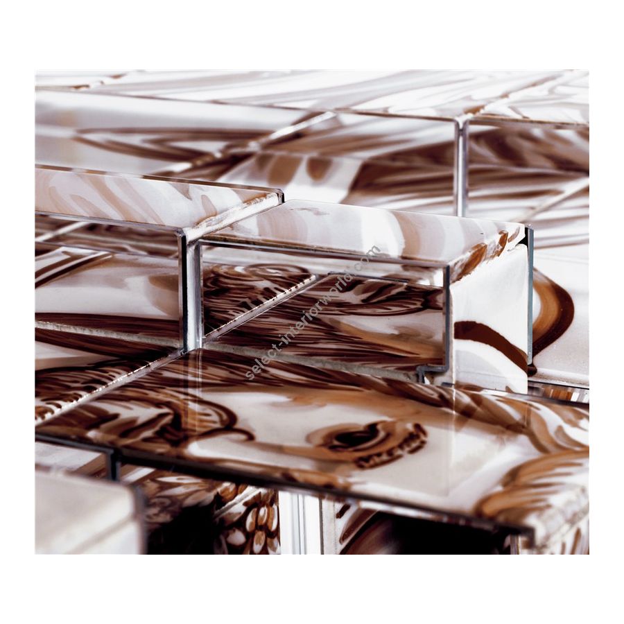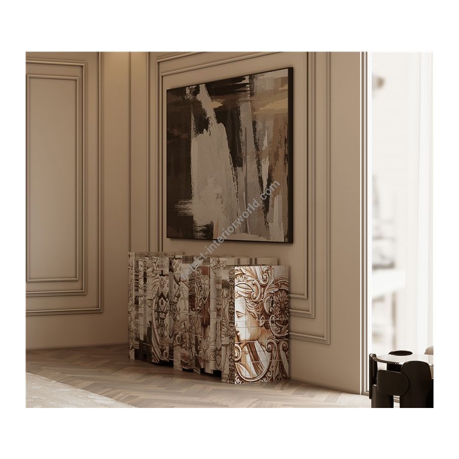 Sideboard lined with hand painted tiles. In its interior there is one door and four drawers fully lined with gold leaf. Contains two shelves made in bronze glass.