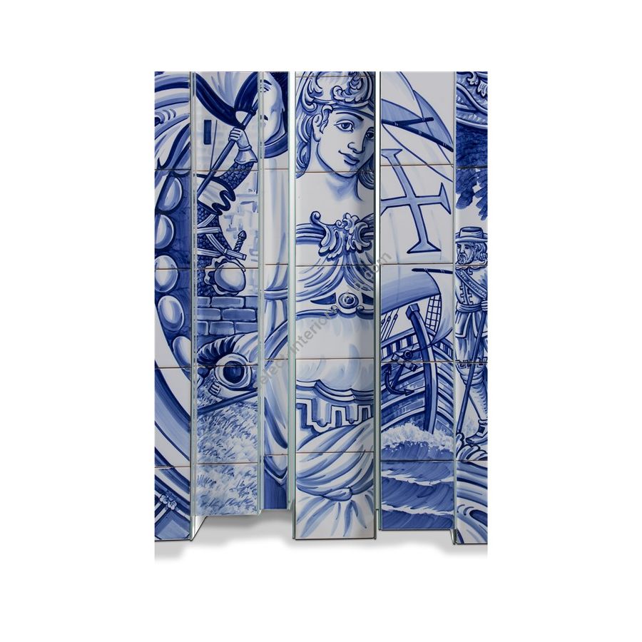 The Heritage Sideboard is a magnificent journey through Portuguese legacy. Covered in Azulejos, traditional hand painted tiles and one of the most representative art forms of Portuguese culture, the architectural sideboard portrays different scenes from the country’s Discoveries era. Centuries of history are gathered in a single final panel, and each layer is enhanced by vertical mirrors on the lateral surfaces. The hint of wander through the rich legacy continues when two door open to a lined glossy gold leaf interior, and a classical ornament trim reminds the inside of churches and rich buildings. A clear glass shelve can be seen on the two individual divisions of the sideboard. A statement sideboard, the Heritage can take center stage in the most elegant rooms since its back is also fully hand painted. A lengthy tradition of bespoke and exclusivity to make one-of-kind design pieces.