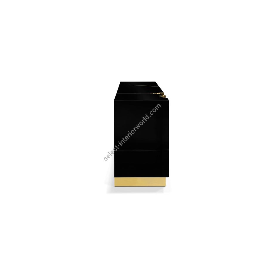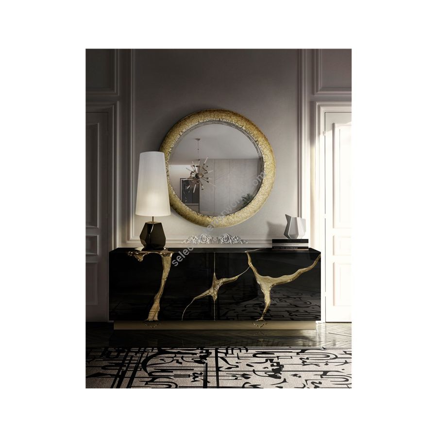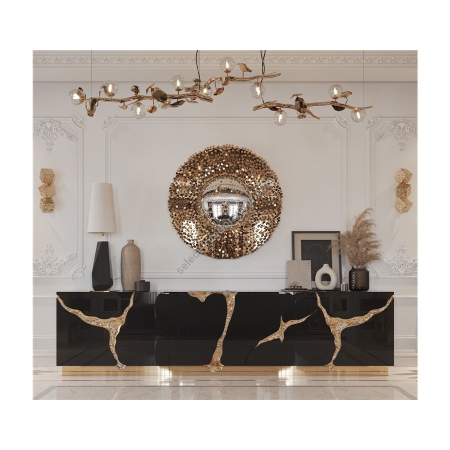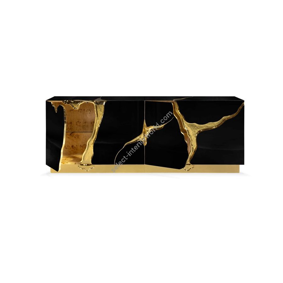 Its organic features are achieved through the manual fitting of polished brass, and a glossy black lacquer finish that bursts from the inside to the distinct exterior façades. Different-shaped doors and drawer are embellished by hammered gold details, conveying both sophistication and elegance to bring a new contemporary verve into refined interiors.