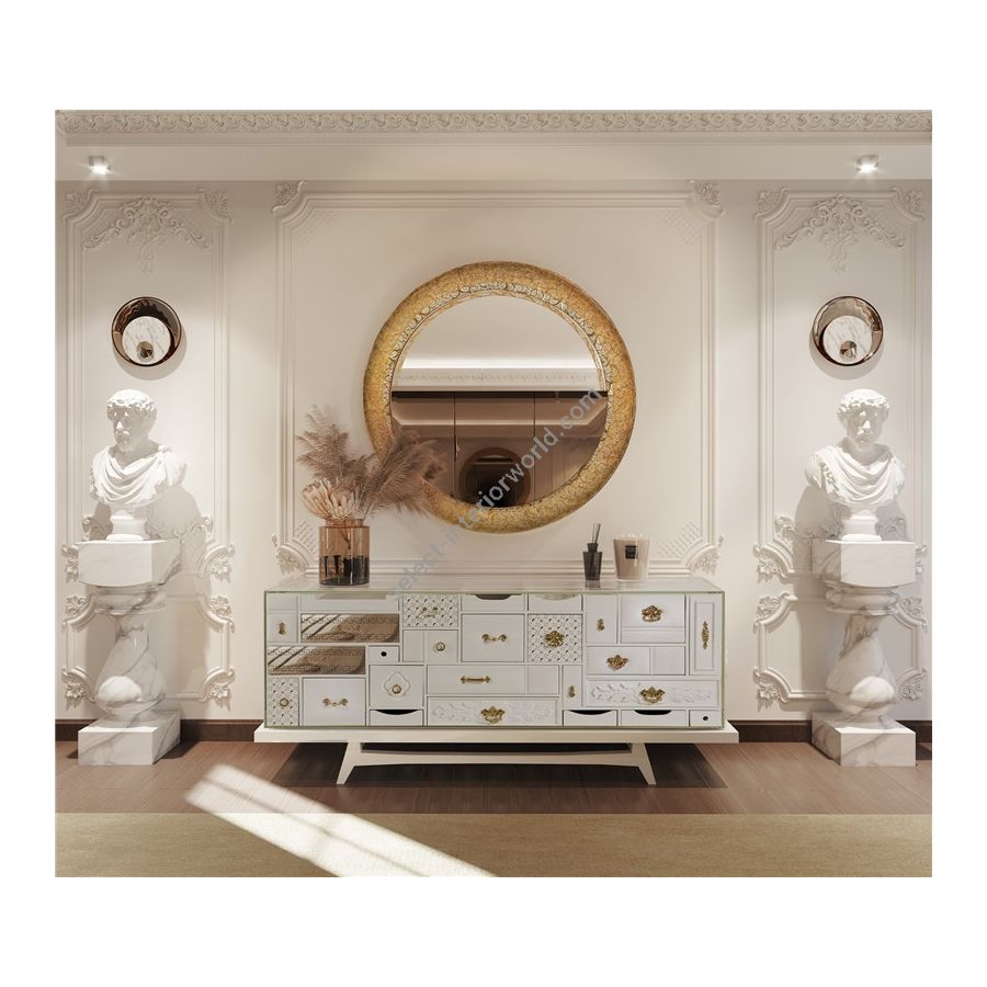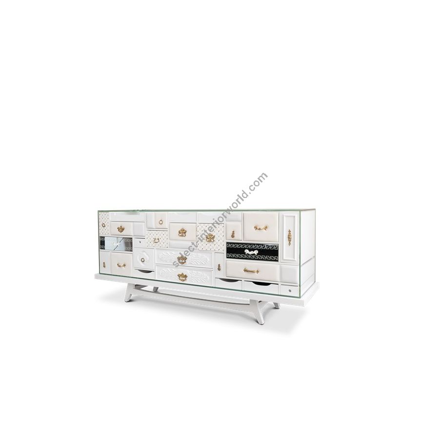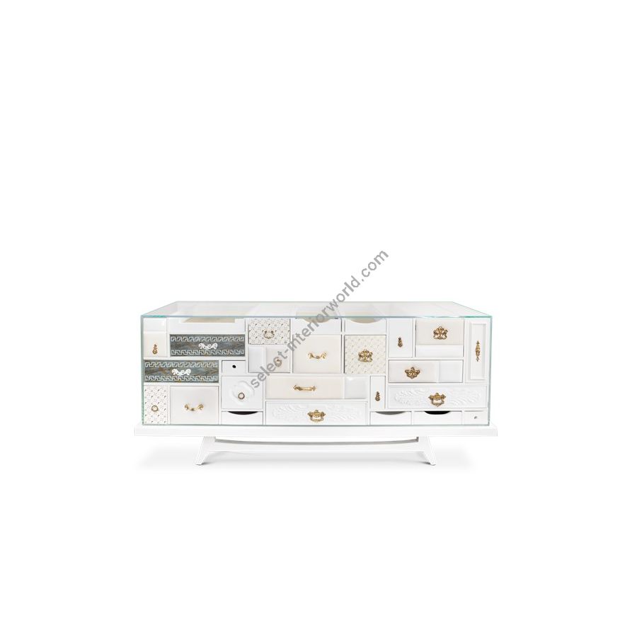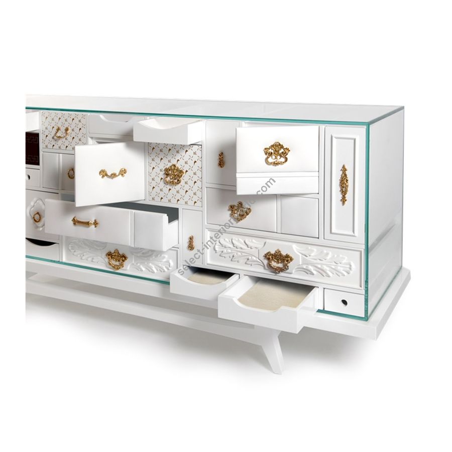 This modern sideboard features a mahogany structure gently involved by an elegant frame of tempered glass. Composed by a set of drawers and doors with different styles, it exhibits from carved details finished in high gloss colored lacquer, mirrors and cut glass, to sophisticated leather details, topped by sleek brass handles with classic shapes and crystals. Quieter hues of white and gold brings sense of la dolce vita, an innate sense of heritage blended with haute couture furniture for a timeless interior design.