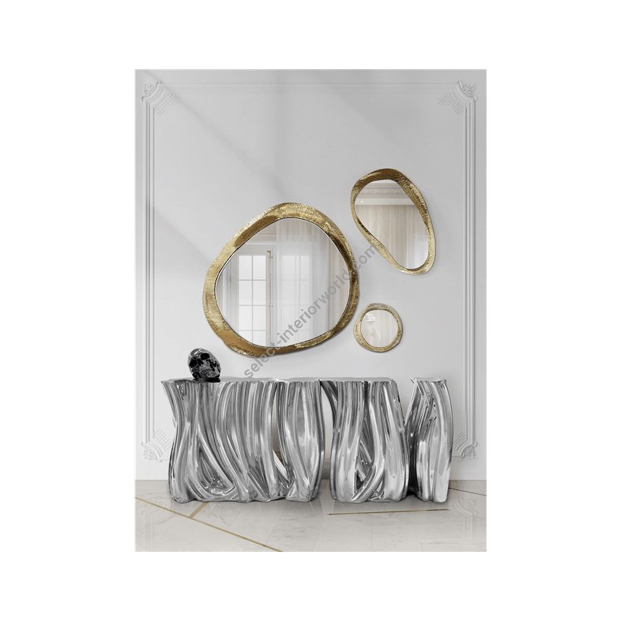 Carefully built from resin, the Monochrome is composed by three separate modules, covered by an exquisite silver finish with a black gradient hint as result of advanced experimentations, and finished with a high gloss varnish coat. An avant-garde console that conveys a seductive and fearless attitude due to its unique and challenging design.