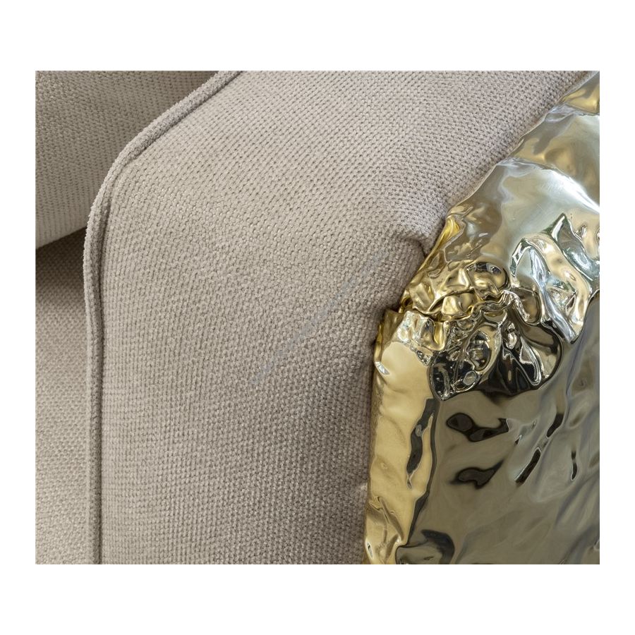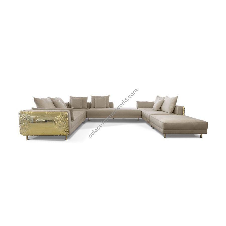 Imperfectio modular sofa is composed of a linear L-shaped sofa paired with upholstered ottoman. The solid wood structure is enveloped by irregular polished brass, founded on elegant slim brass feet. Available in wide selection of natural and bright colors.