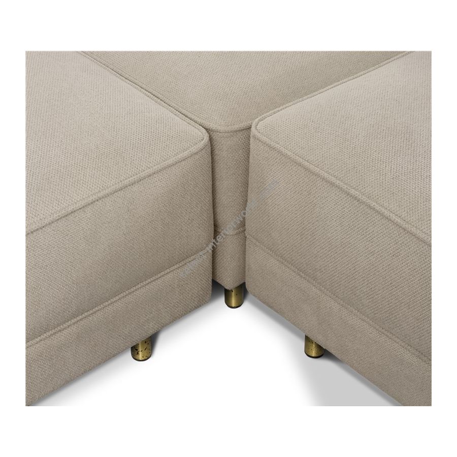 L-Shaped modern sofa paired with upholstered ottoman. Solid wood structure enveloped by polished brass, founded on slim brass feet.