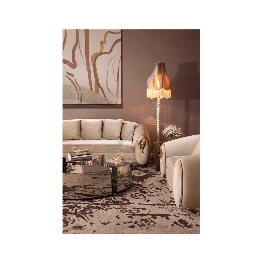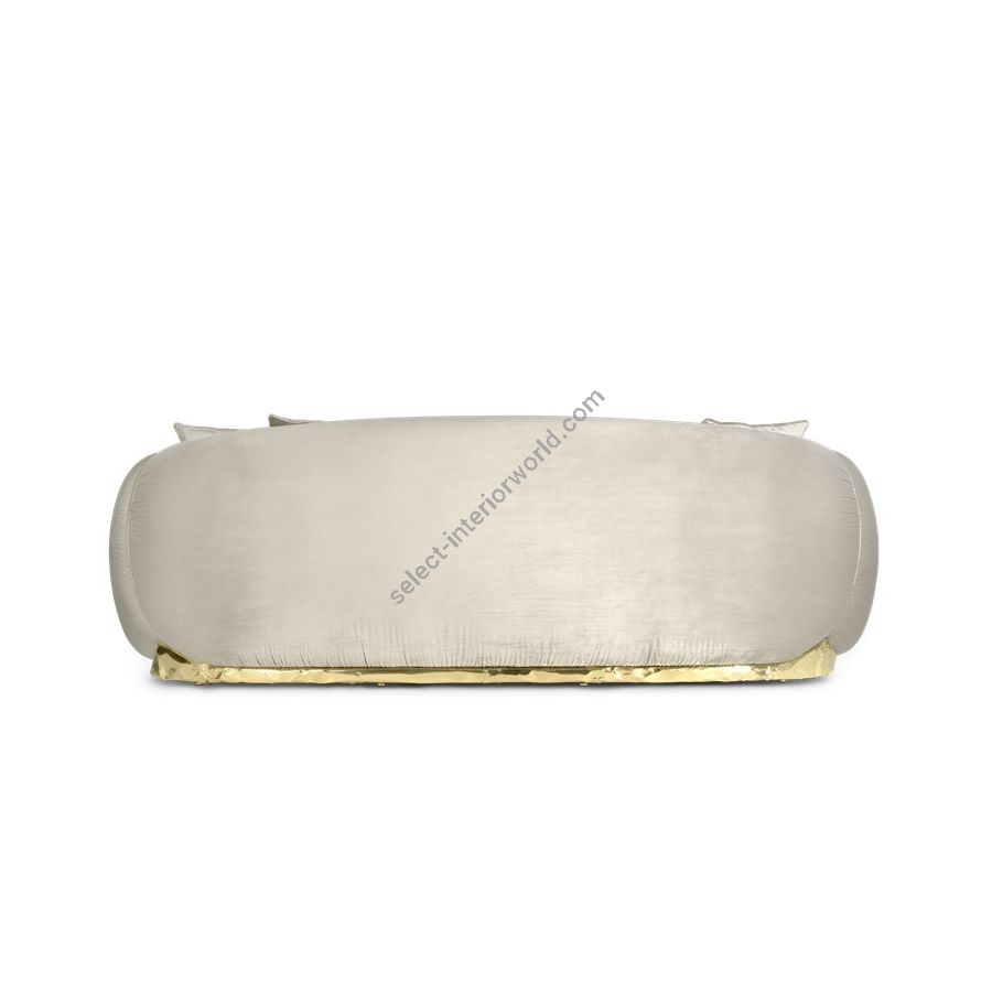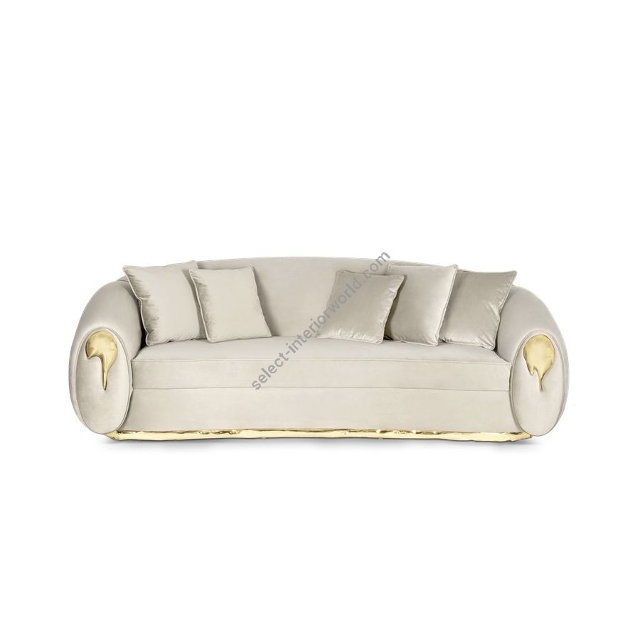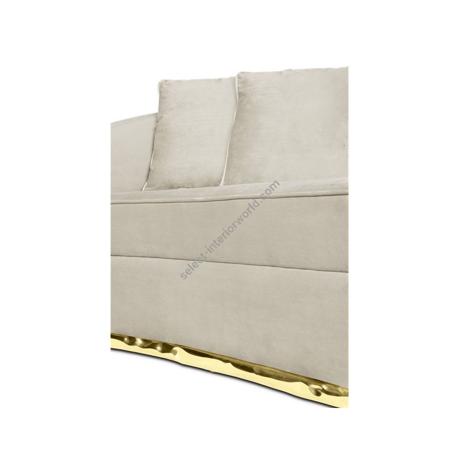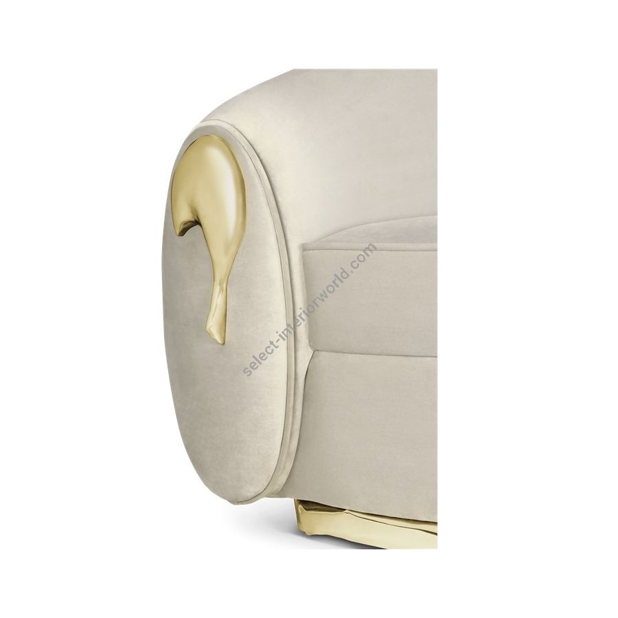 Soleil Sofa is a synthesis of styles and senses. Inspired by the spirit and mission of the famous Cirque de Soleil, the purpose is to invoke, provoke and evoke. Soft, sultry curves gently embrace the sitter in this elegant vintage and contemporary style sofa. Except for the supreme levels of comfort, the brass details on the modern sofa perfectly complement the elegant lines of a timeless piece.