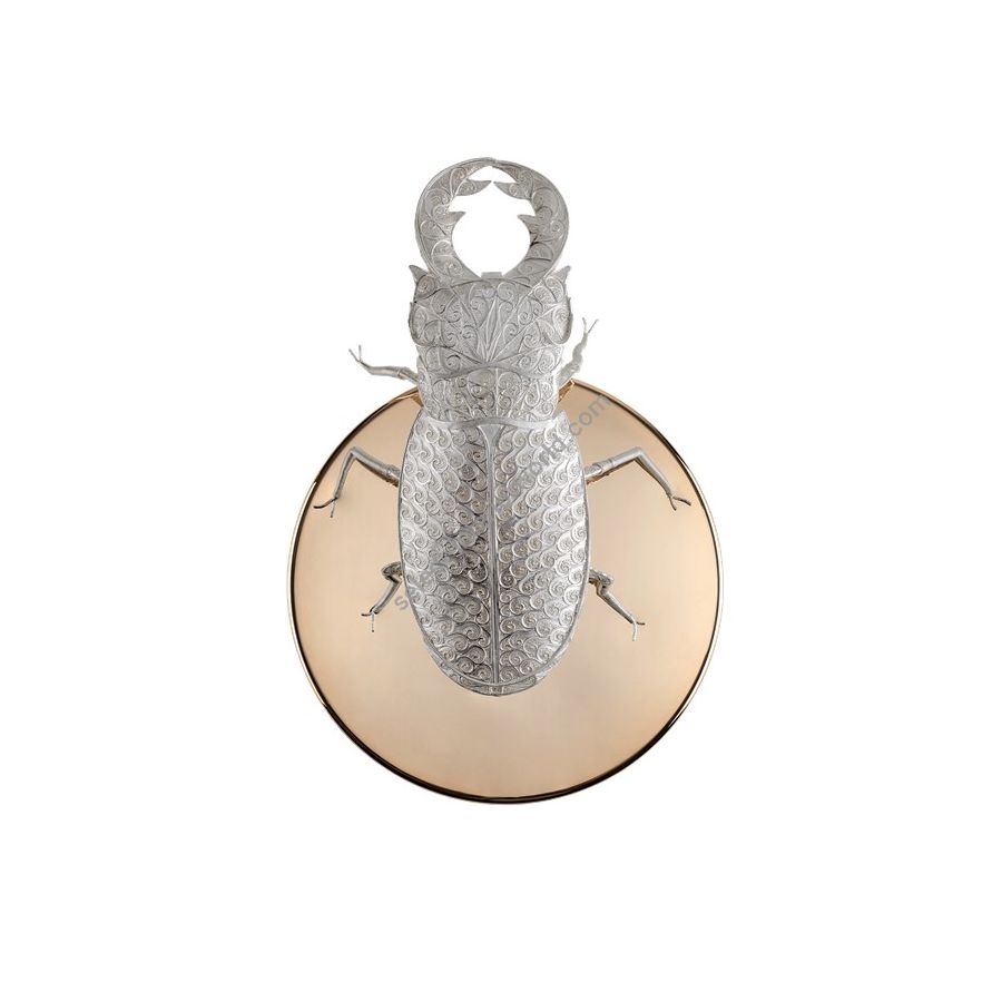 The Lucanus sconce brings a sophisticated symbiosis between a rare insect figure and the pure beauty of the silver filigree. The plate is made of polished brass and gold plated and completes this masterpiece.