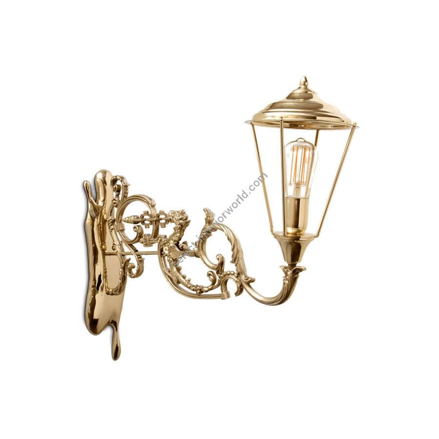The mystic of late XIX century boulevards are brought home by the cutting-edge Lumière wall lamp. A confluence of Victorian street lights and architectural tectonic form, the Lumiére exemplifies the contemporary dualities of art and functionality. An antique fixture in polished gold plated brass with an intricate edge detailing arm topped by an elegant pane glass lantern hand-sculpted by a casting mold. Born from the rich tradition of iron forging and skilled goldsmiths, this majestic wall lamp is a soulful piece with classic distinction for outstanding private residences to the greatest contract settings. A ground-breaking collectible design for present-day luxe and timeless statement.