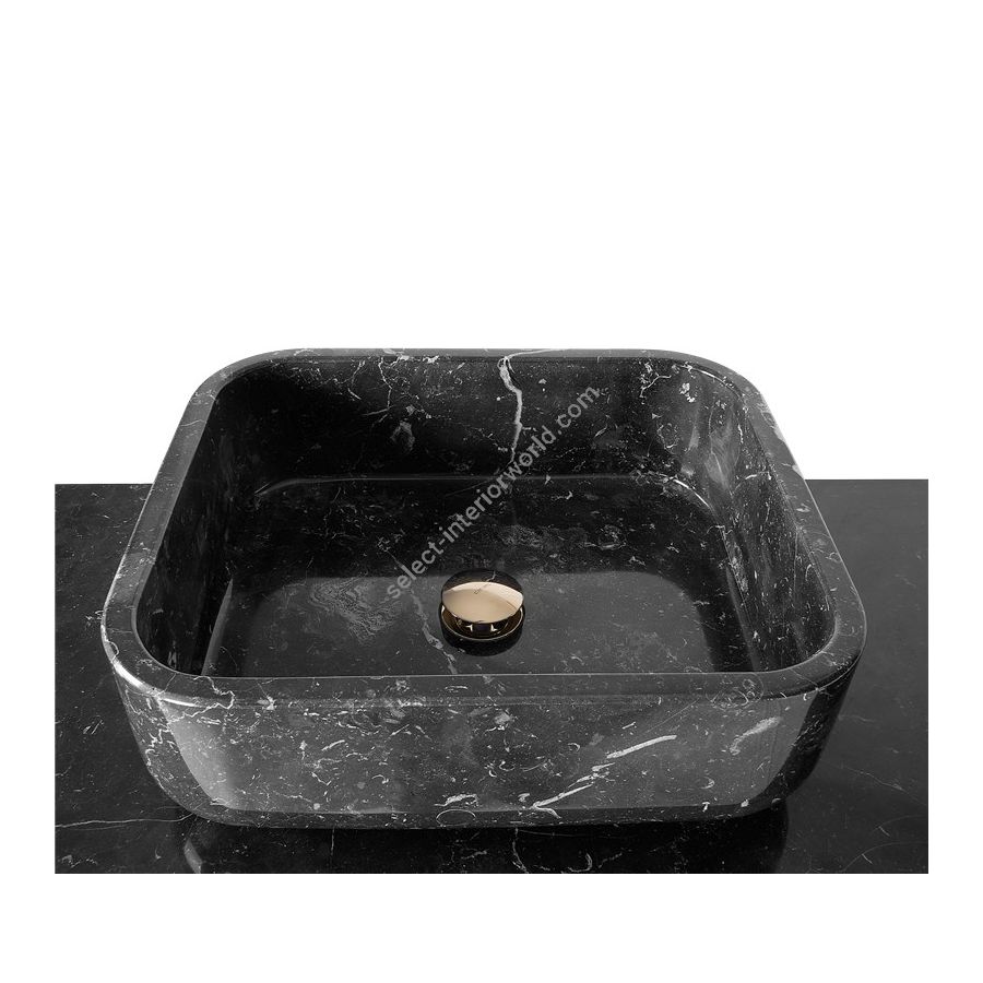Structure: Wood with black lacquered hand-carved mirror on top; Top: Nero Marquina Marble Sink: Nero Marquina Marble Feet: Black Lacquered High Gloss Varnish; Water drainage: Wall