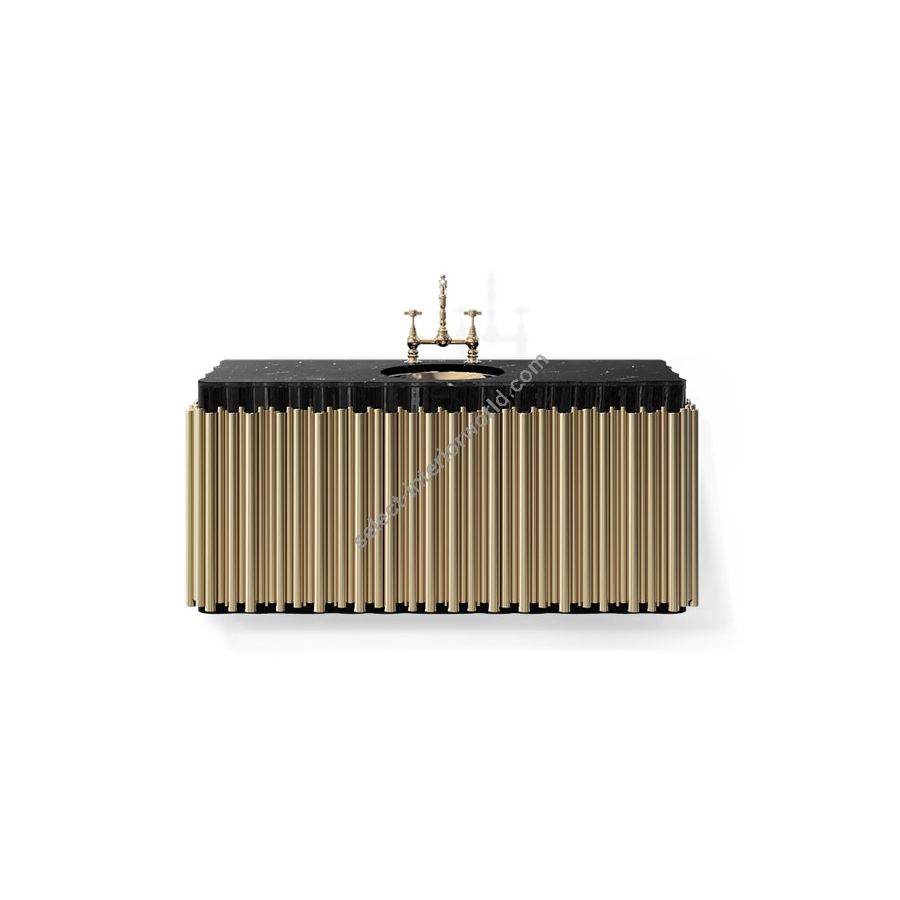 Structure: Wood, High Gloss Black Lacquered; External Structure: Gold Plated Brass Tubes, High Gloss Varnish; Top: Nero Marquina Marble; Sink: Polished Brass, High Gloss Varnish; Water drainage: Wall