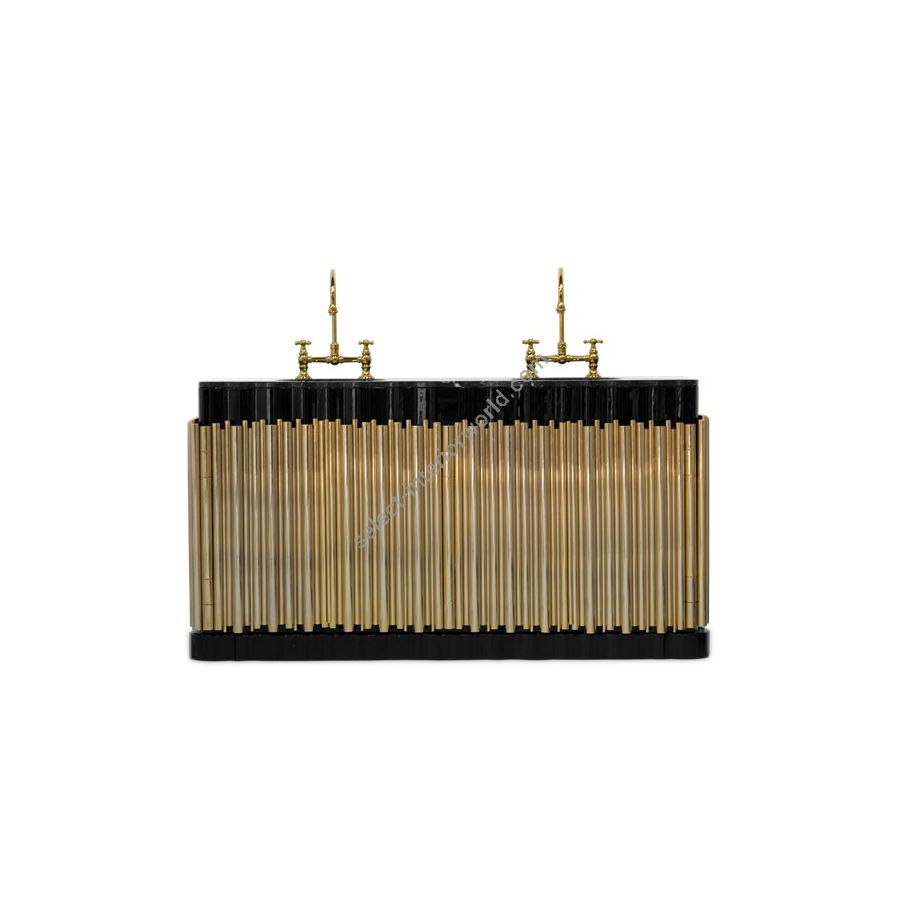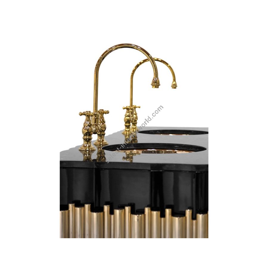 Structure: Wood, High Gloss black lacquered | Gold plated brass tubes, High gloss varnish; Top: Nero Marquina marble; Sink: Polished Brass, High Gloss Varnish; Water drainage: Wall
