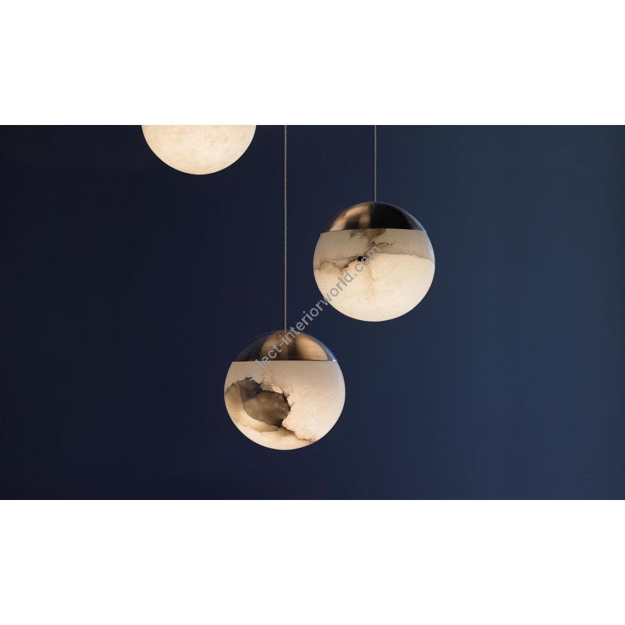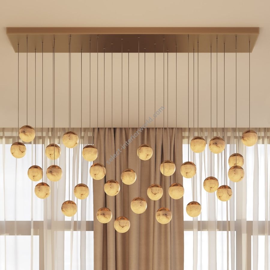 The Callisto Linear fixture features brass and alabaster moons that cascade through your interiors. Each alabaster sphere is hand carved, featuring a unique pattern and natural beauty. There are three lengths; 36″ / 48″ / 60″ versions. Designed by Boyd Studios. The Callisto Linear can be modified for different lengths and widths to suit the needs of your space.