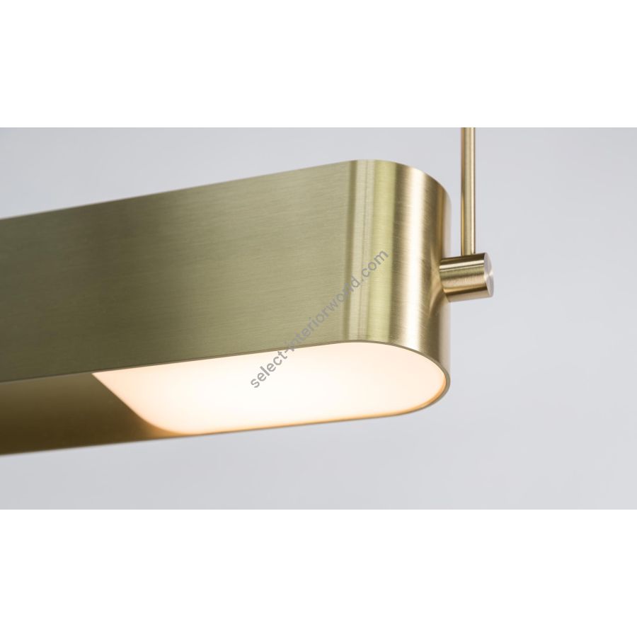 A beautiful linear hand-finished loop of brass that gently cradles a curvilinear white cased glass diffuser at either end. Patent Designs: D948,772.