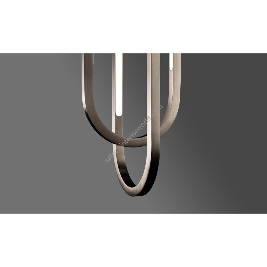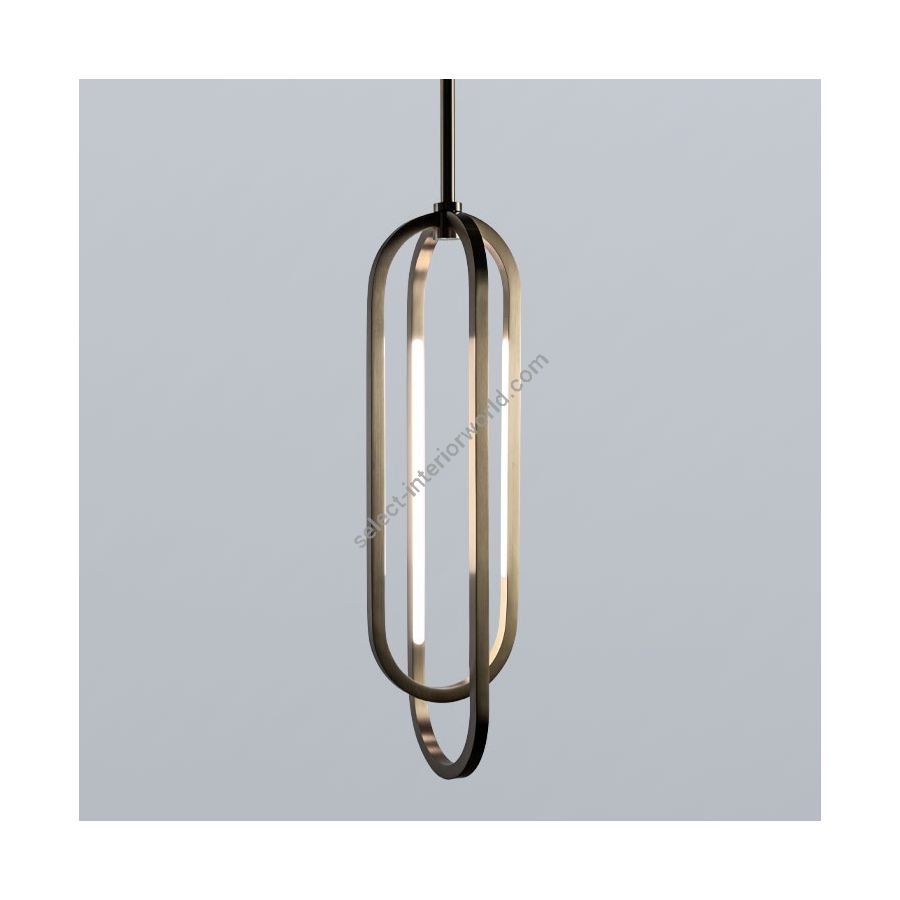 A thin profile brings airiness and minimalism to this elegant series of pendants designed by Doyle Crosby. Square tubes of hand-finished brass form geometric crisscrossing double obround loops that illuminate from within satin white diffusers.
