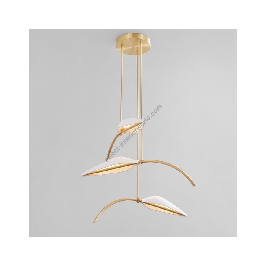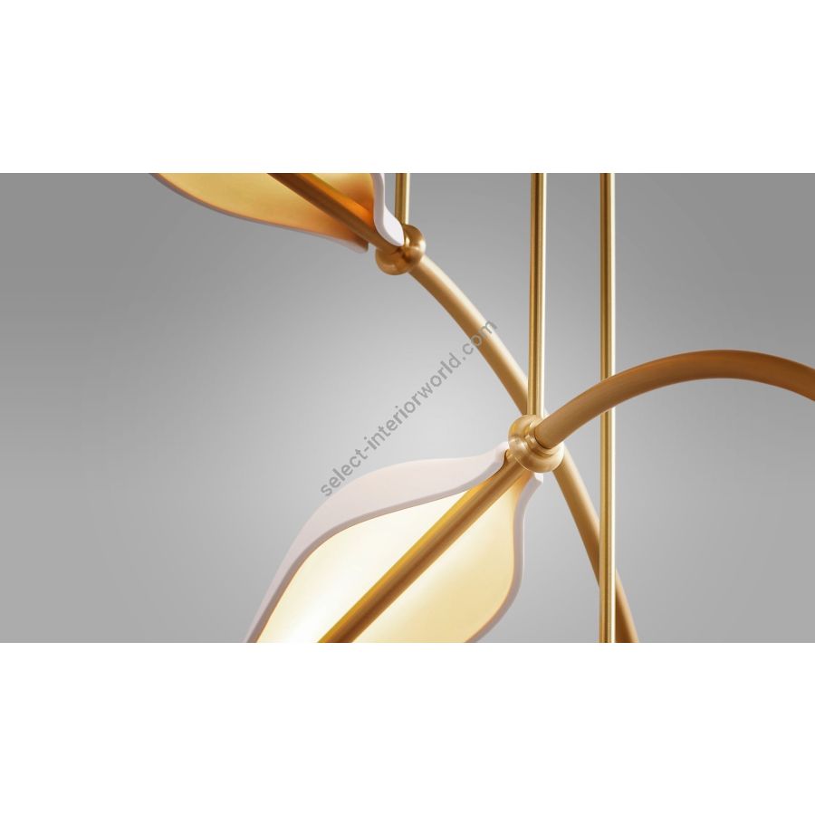 Blending the architectural details of a church spire with the softness of leaves, the cast porcelain shade emits a beautiful glow, illuminated from within turned brass rods. These falling leaves can be oriented on-site to ensure that this statement piece illuminates your interior with a natural ambiance. Designed by Jake Oliviera.