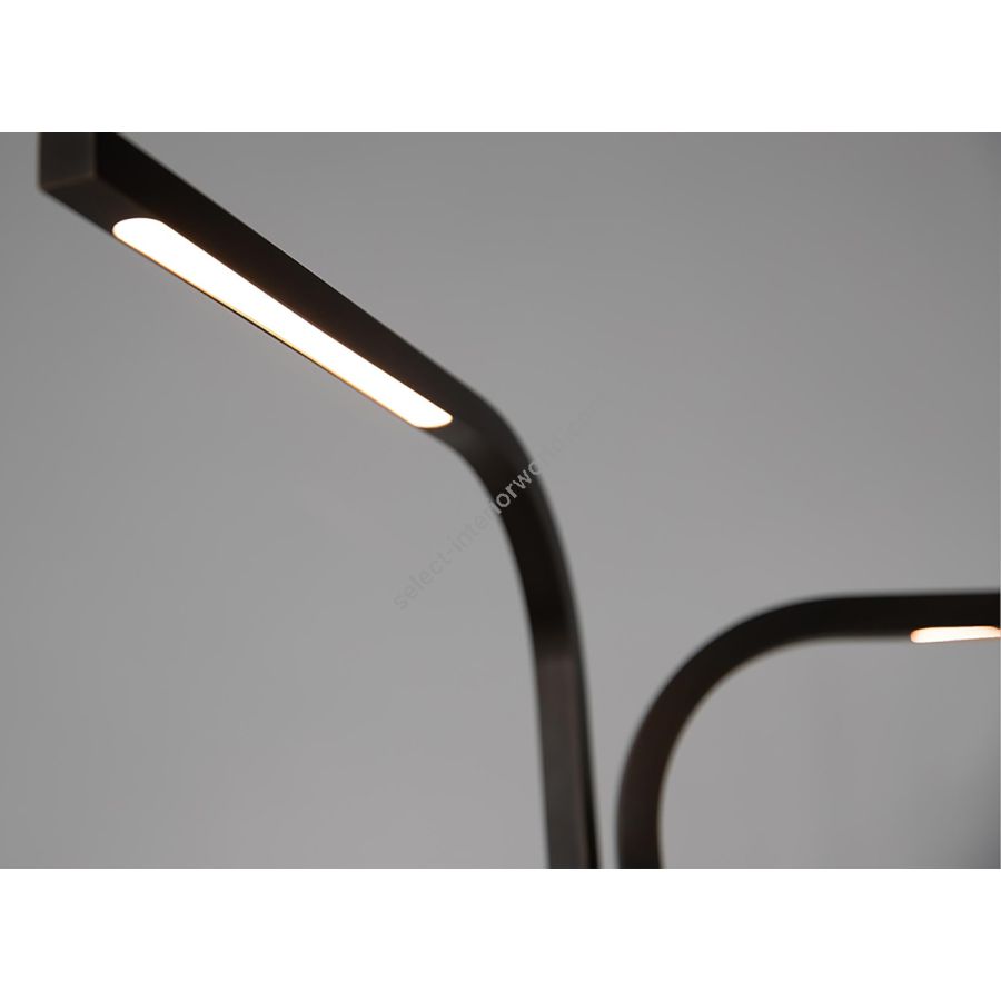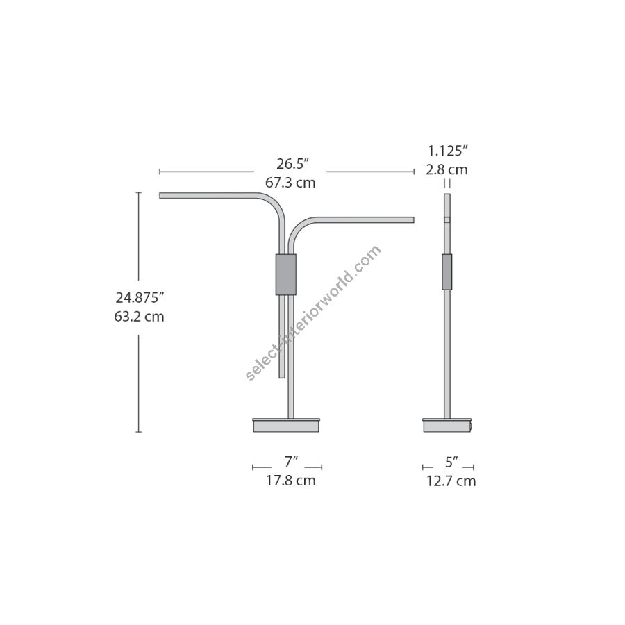 The swing-arm table version of the Branch Series offers multi-directional illumination with a stationary bottom arm and a top arm that rotates 180°. On/Off switch on base. Diffuser in satin white silicone.