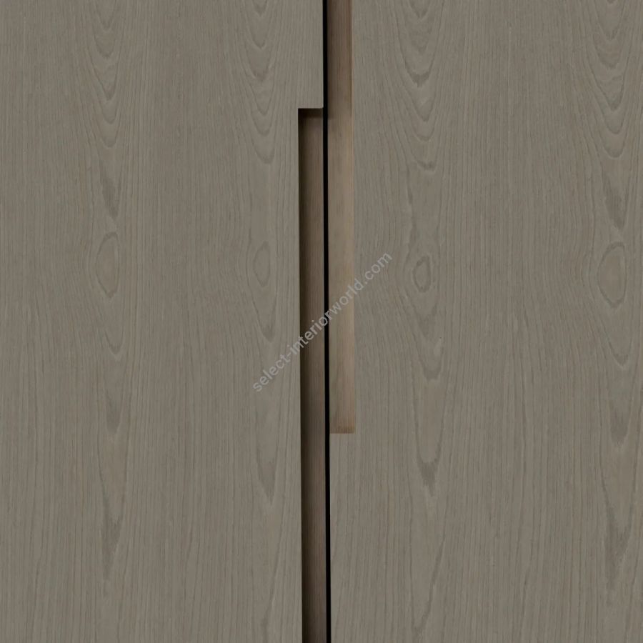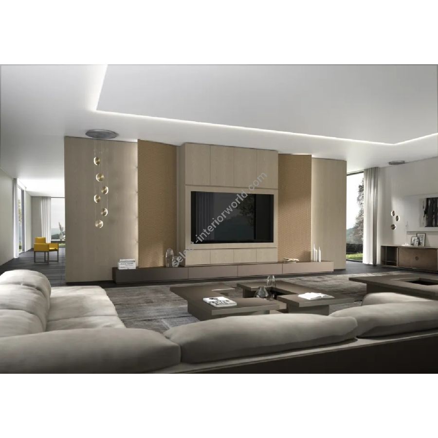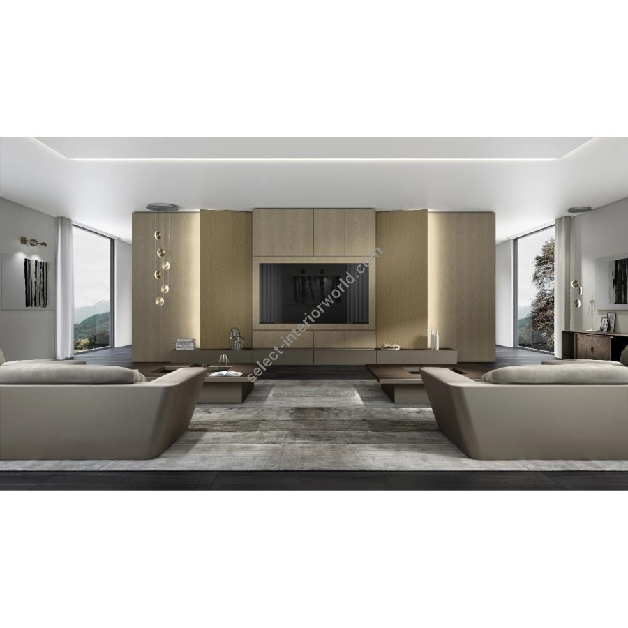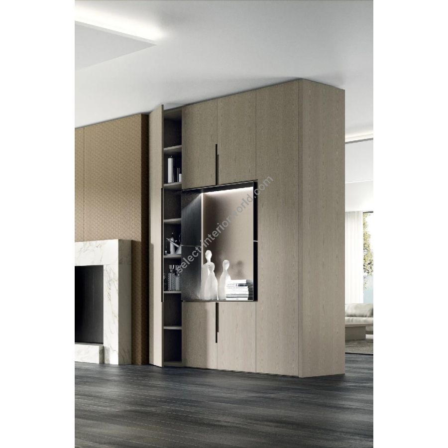 Cabinet system for the living area in plain wood with horizontal or vertical grain. Available in modules of different sizes, with customized niches and accessories, and with integrated LED lighting.