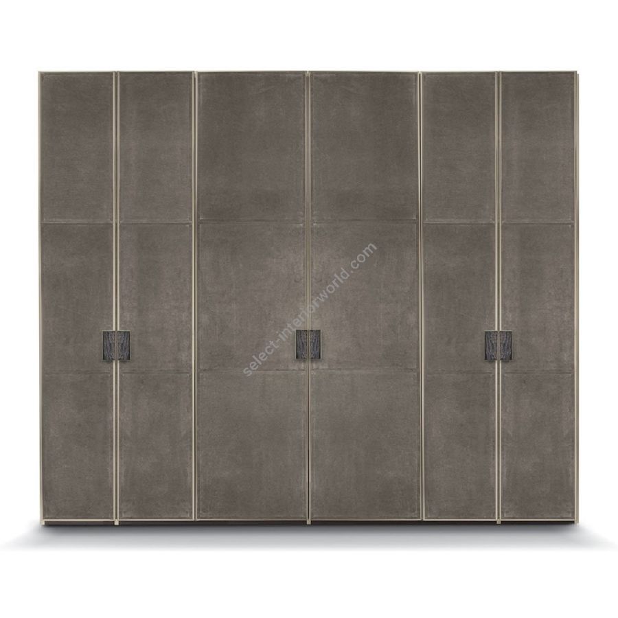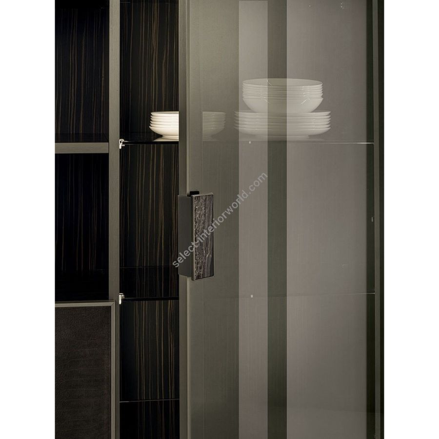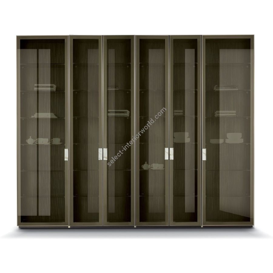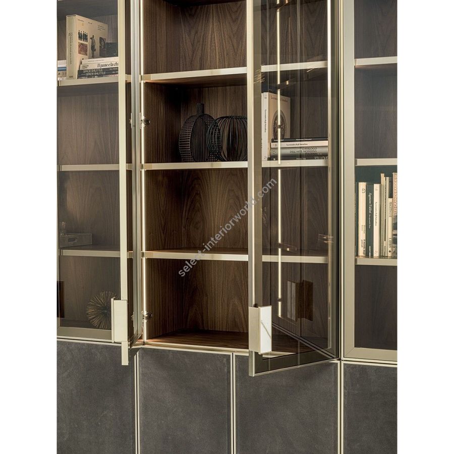 Ianus Middle is a modular system for building equipped partition walls with open compartments, chests of drawers, shelves and small doors that can be inserted to perfectly complete the modular nature of the boiserie panels and the doors. The structure is in veneered wood in the finishes: matt tinted Zebrano wood, matt Canaletto walnut, matt Newood Ebony or closed pore matt lacquer. Front edges of modules and door profiles are in anodized aluminium finishes, as follows: Matt Platinum, Matt satin bronze, Bright Aluminium, Bright Champagne Gold, Bright dark brown electrocolour. The shelves are in dark matt tinted Zebrano wood, matt Canaletto walnut, matt Newood Ebony, closed pore matt lacquer, covered in P.3 Cat. Suede or Tecsuede, or in natural, bronzed, or smoky 8 mm glass. Drawer fronts are covered in leather P.3 Cat. Suede or Tecsuede. Drawer interior bottoms are in wood or lined with leather P.3 Cat. Suede or Tecsuede. The side panels have LED lighting over their entire height. The system includes a special 180 cm module customizable for the TV. NOTE_the side panel includes an adjustable foot.