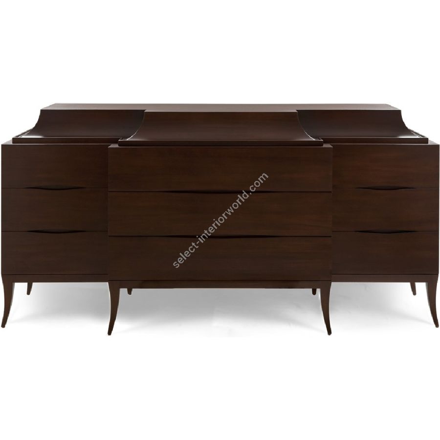 Handsomely hand carved from mahogany, this sleek cabinet is designed with two additional outer side doors with four-drawer chest, including one drawer concealed in the curved top section, also available in a single four-drawer chest version.
