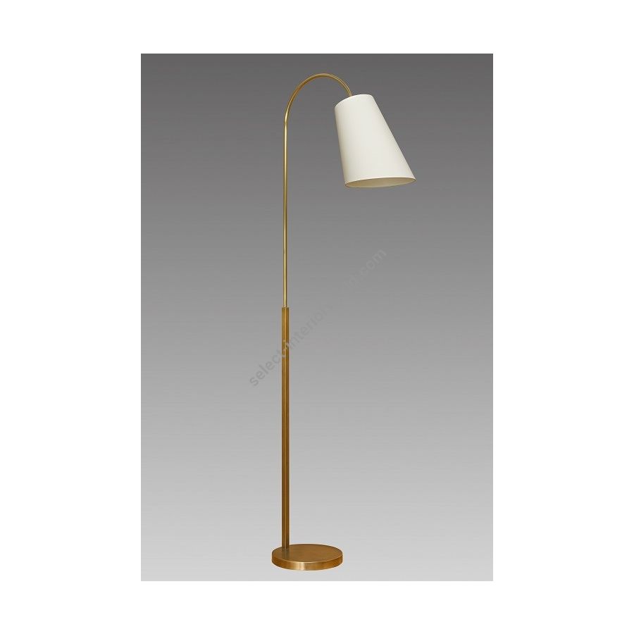 Floor lamp made in brass Made with a curved round tube on a round base This contemporary, with a classical touch, floor lamp is perfect for your ambiance or reading in a living room, a bedroom or in an office Available on black or matt gold patina Presented lamp shade in white cream cotton chintz in a conic shape (see other available colours).