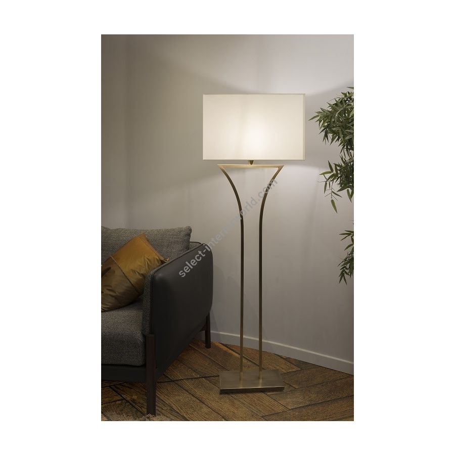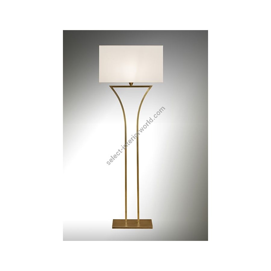 Floor lamp made in brass It is made with two square tubes forming harmonious curbs on a rectangular base This floor lamp with an elegant design nicely decorates a living room, a bedroom or an office Available in black or matt gold patina Presented rectangular shade in white cream chintz (see other available shapes and colors).