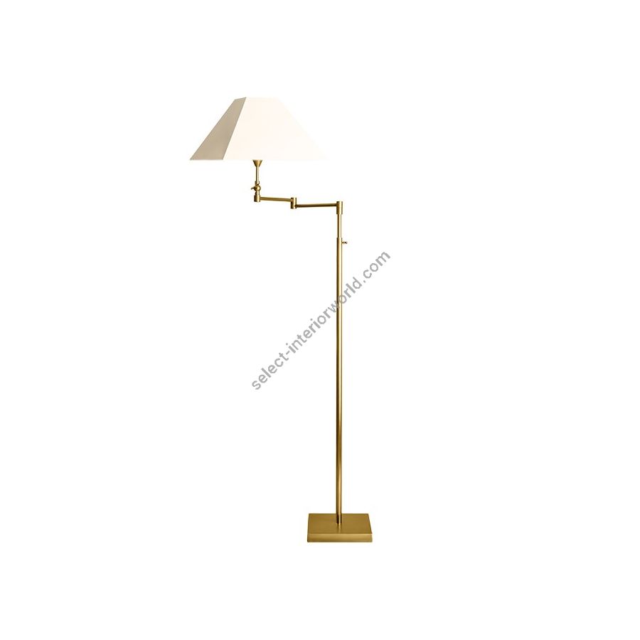 Floor lamp in brass. Made with a ajustable round tube with a swing arm, on a square base. This contemporaryl floor lamp gives a deported lighting thanks to its adjustable tube and its swing arm. Available in black or matt gold patina. Presented lamp shade in white cotton chintz in a conical shape (see other available shapes and colours).