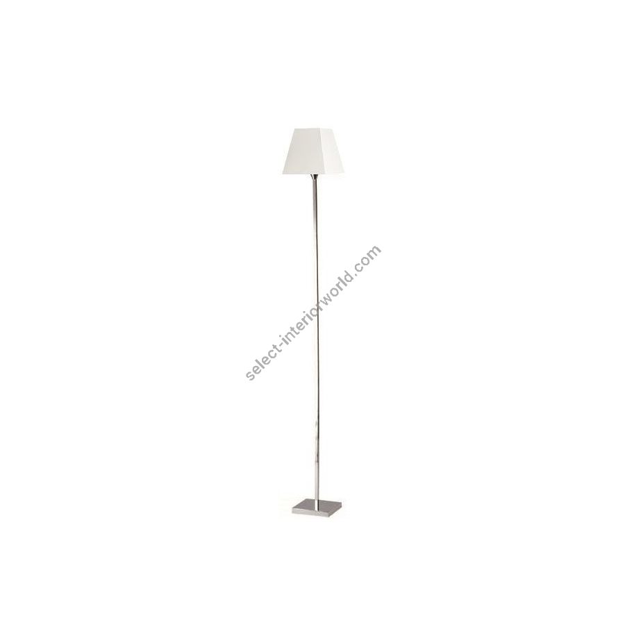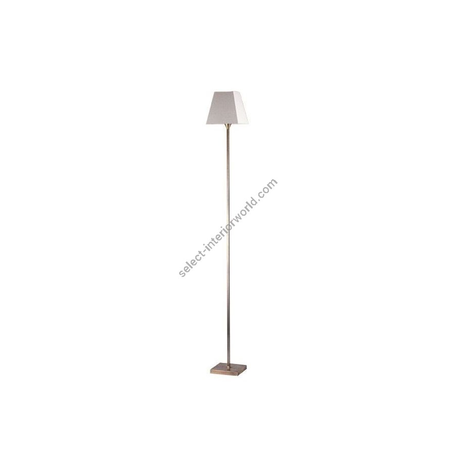 Floor lamp in brass. Made with a square tube on a square base. This sober and elegant floor lamp remains discrete in your interior. Available in black or matt gold patina, and in nickel. Also exists in small (LD58A) or medium size (LD58B). Presented lamp shade in white cotton chintz in a pyramidal tapered shape (see other available shapes and colours)