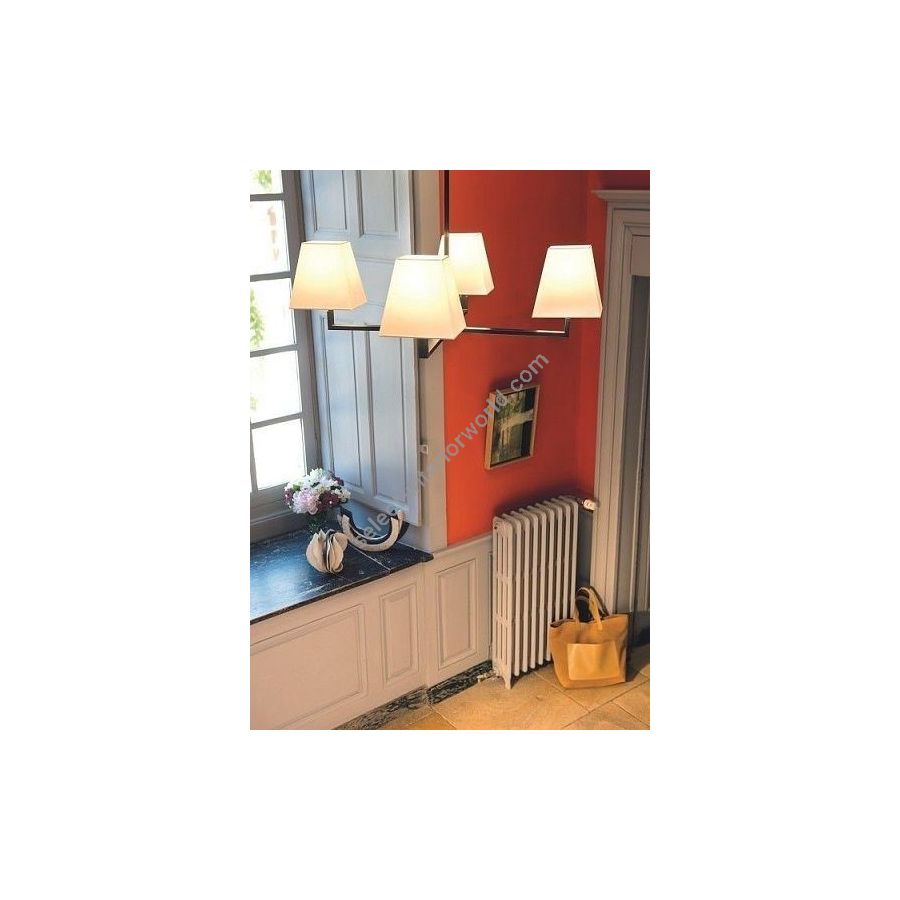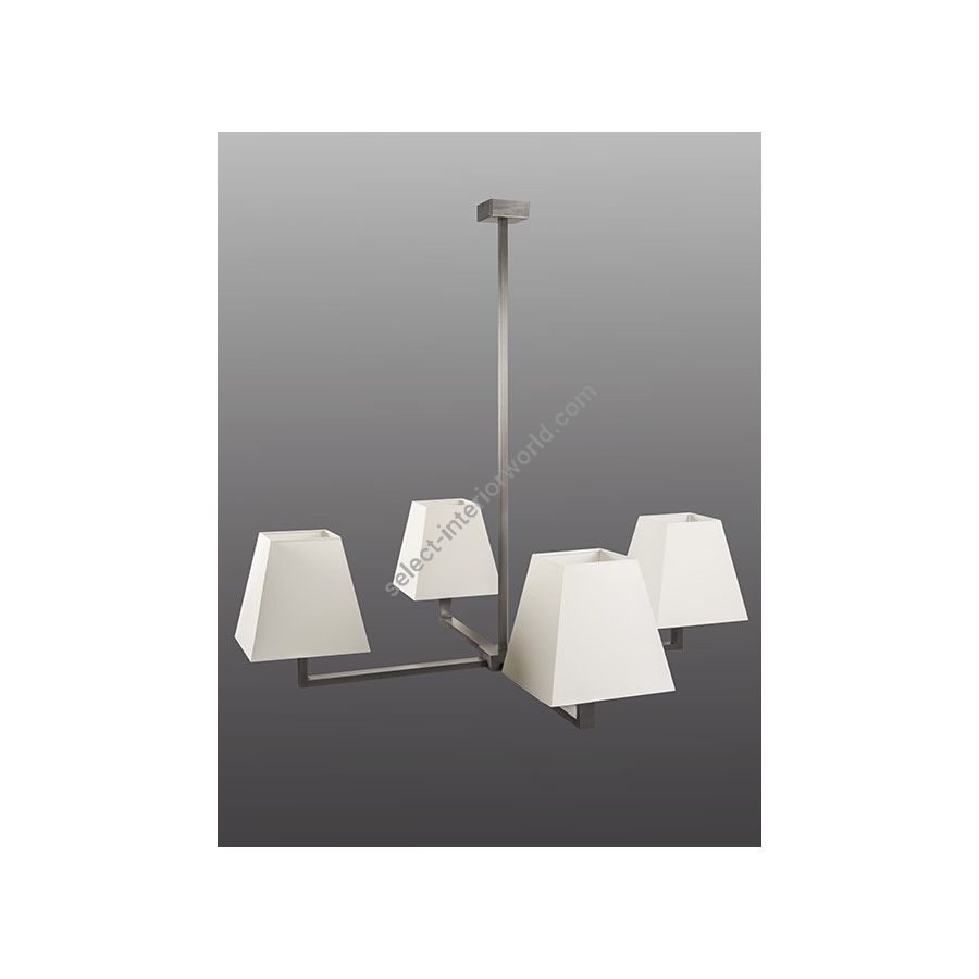 Ceiling light made in brass. Made with 4 crossed square tube fixed on the ceiling with a square tube on a square base. Height may be adjusted on demand. This contemporary ceiling lamp discretely gives a nice lighting from the ceiling. Available in black patina. Presented lamp shade in white cotton chintz in a rectangular tapered shape.