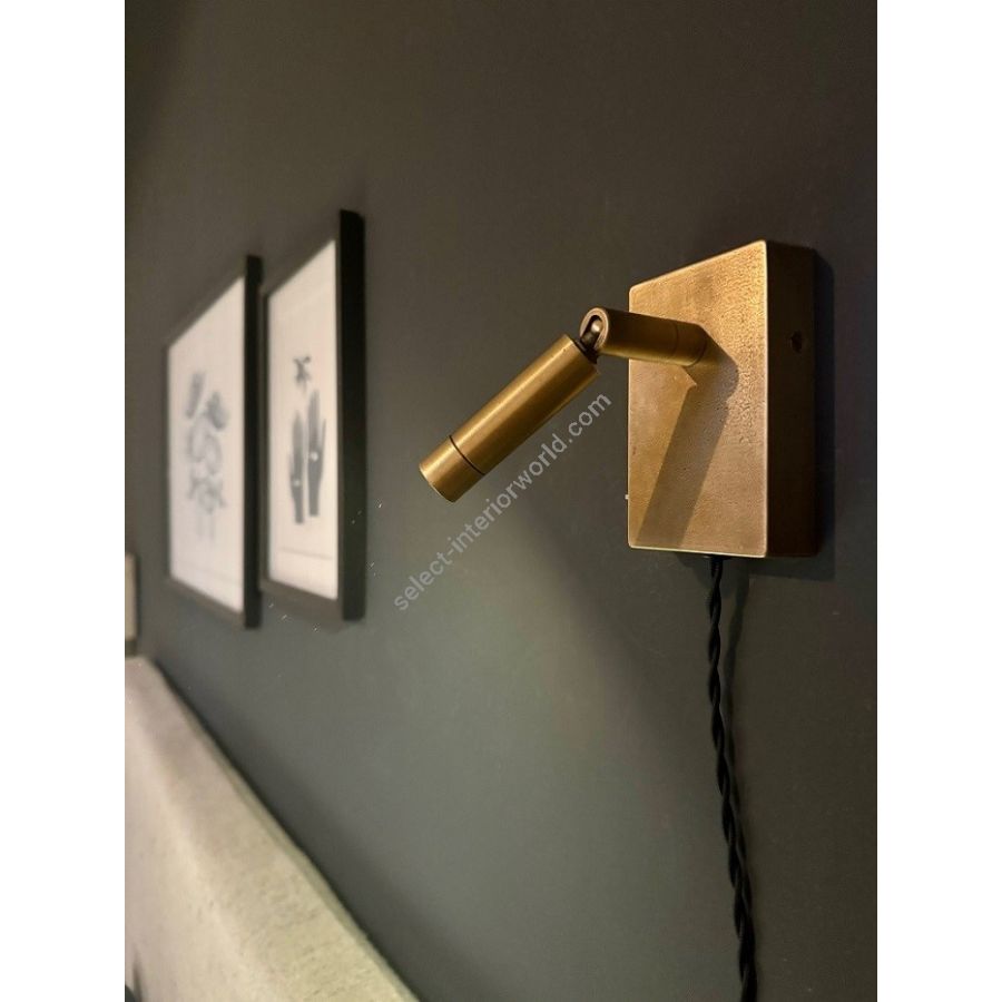 Wall light with Led light made in brass. Made with a led head fixed with a rotating kneecap, on a rectangular base without switch. This reading wall light gives a sober and elegant design, and an efficient direct light. Available in black or matt gold patina, and in nickel or brushed nickel