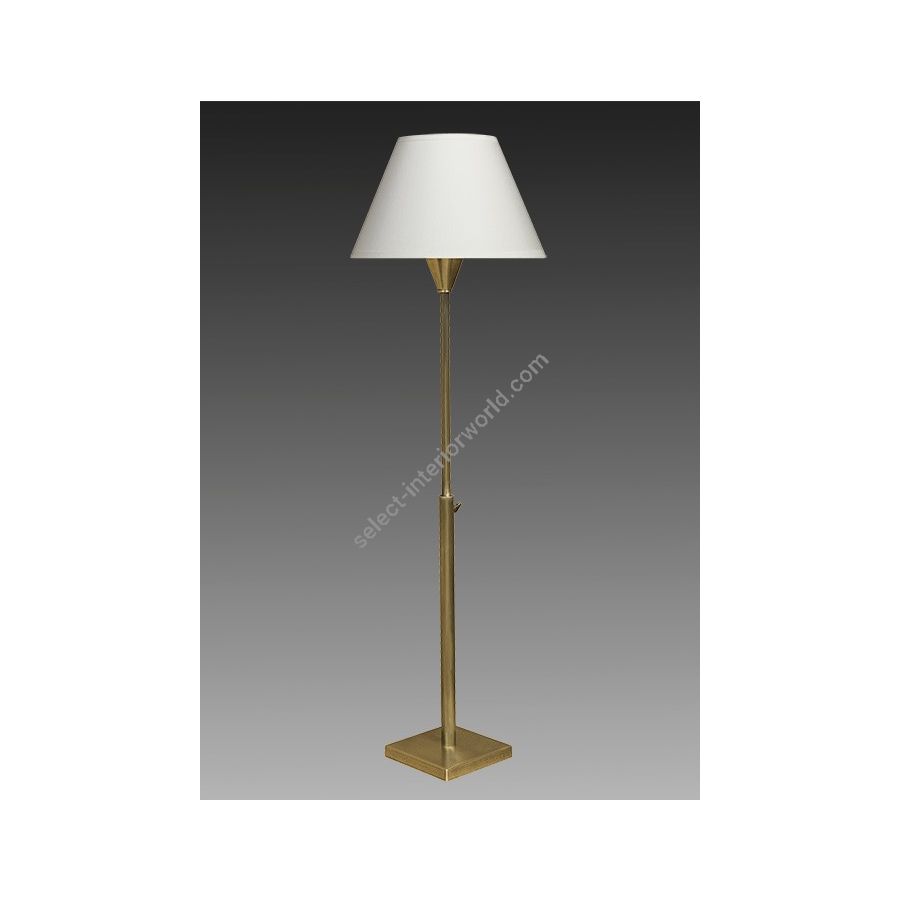 Lamp in brass. Made with a adjustable round tube on a square base. This classical lamp gives a changing lighting thanks to its adjustable tube. Available in black or matt gold patina, and in nickel or brushed nickel. Presented lamp shade in white cotton chintz in a conic shape (see other available shapes and colours)