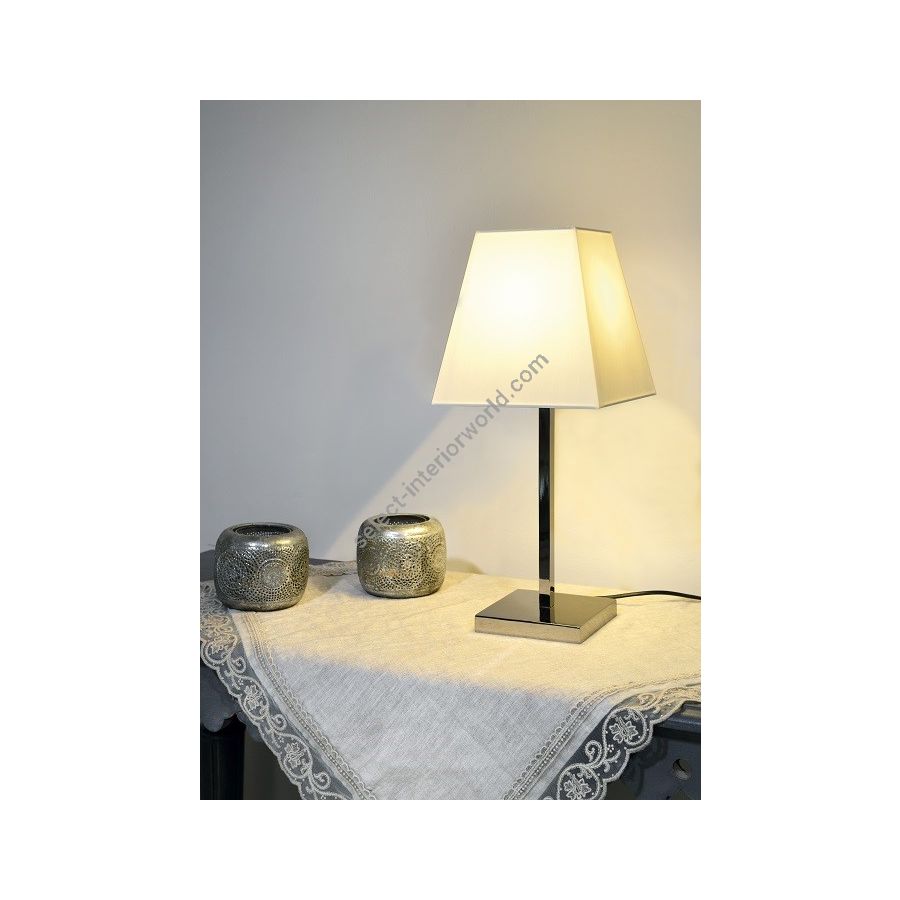Lamp made in brass. Made with a square tube on a square base. This evergreen lamp gives a touch of discrete elegance to your interior. Available in black or matt gold patina, and in nickel. Also exists in large size (L110BIG). Presented lamp shade in white cotton chintz in a pyramidal tapered shape (see other available shapes and colours)