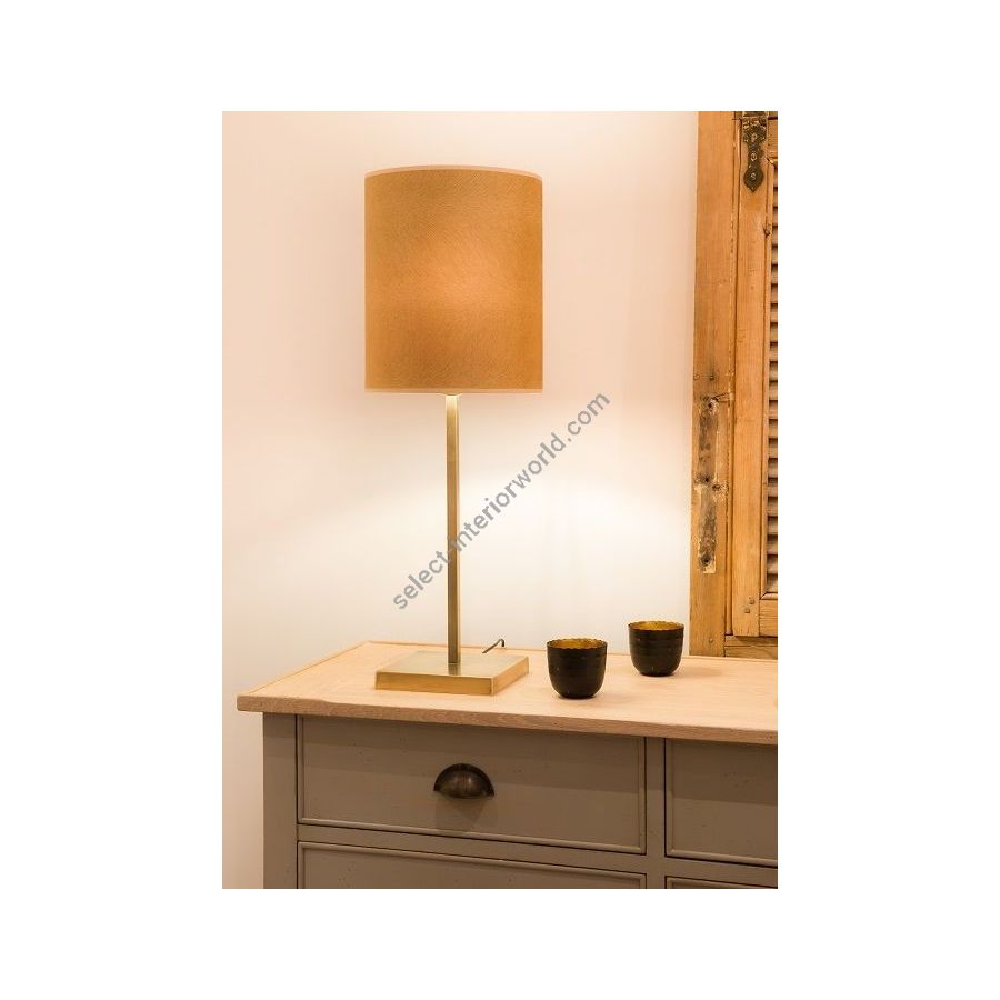 Lamp made in brass. Made with a square tube on a square base. This evergreen lamp gives a touch of discrete elegance to your interior. Available in black or matt gold patina, and in nickel. Also exists in small size (L110). Presented lamp shade in white cotton chintz in a pyramidal tapered shape (see other available shapes and colours)