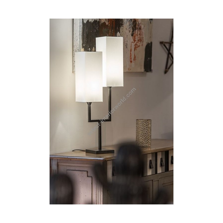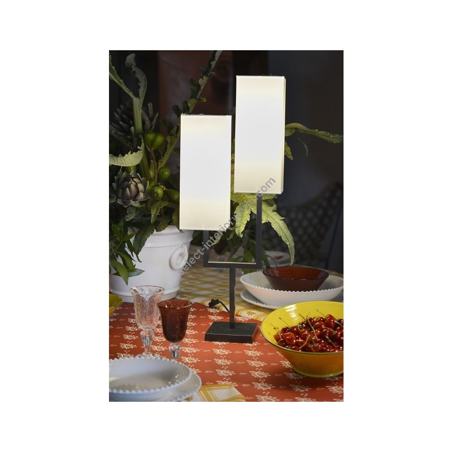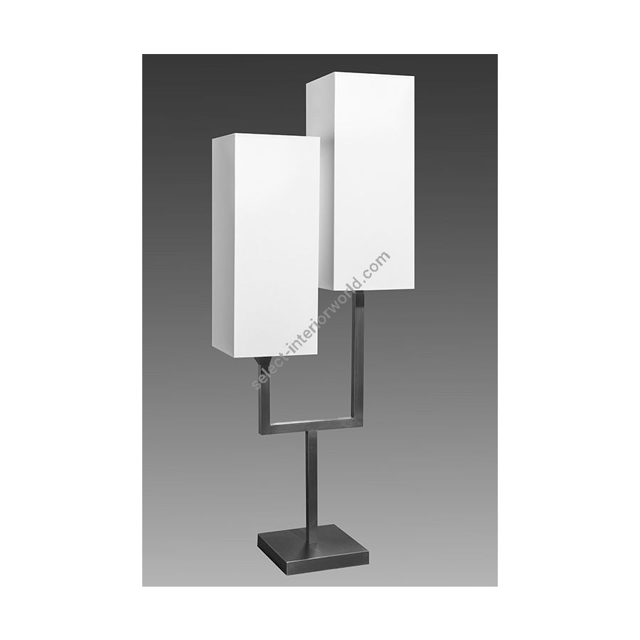 Lamp made in brass. Made with a square tube as a double torch on a square base. This contemporary lamp gives an elegant design to your interior. Available in black or matt gold patina. Presented lamp shade in white cotton chintz in rectangular shape (see other available shapes and colours)