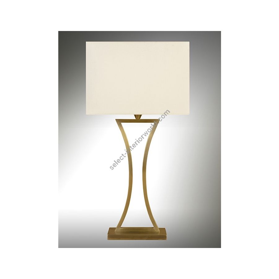 Lamp made in brass It is made with two square tubes forming harmonious curbs on a rectangular base This table lamp with an elegant design nicely decorates a living room, a bedroom or an office Available in black or matt gold patina Presented cylindrical shade in white cream chintz (see other available shapes and colors)