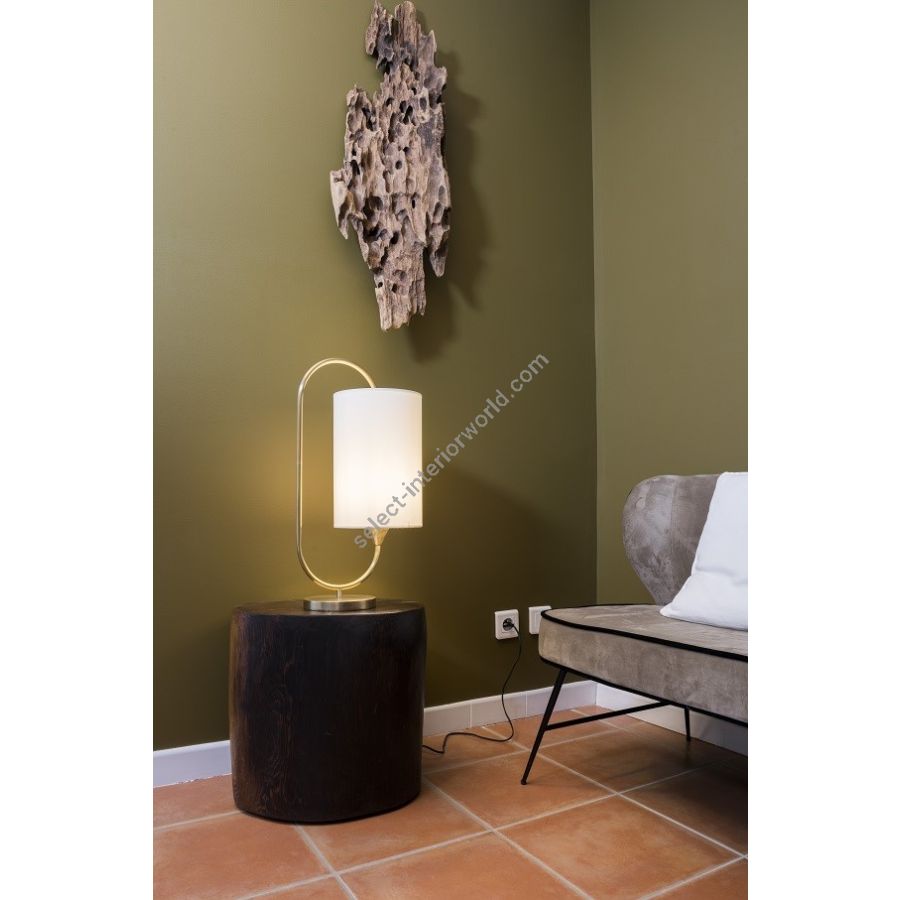 Lamp made in brass It is made with a round tube showing an elegant oval which encloses the lamp shade, on a round base This lamp with a nice design decorates with elegance a living room, a bedroom or an office Available in black or matt gold patina Presented cylindrical shade in white cream chintz (see other available colors)