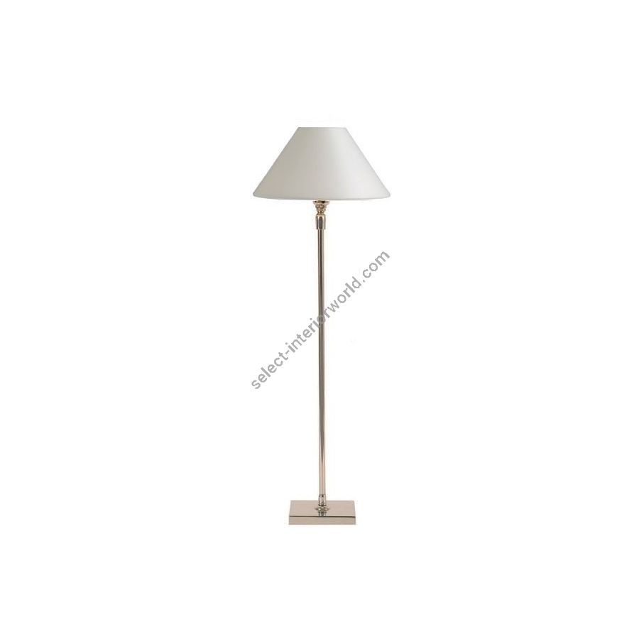 Lamp made in brass. Made with a round tube on a square base. This contemporary lamp discretely decorates your interior. Available in black or matt gold patina, and in nickel or brushed nickel. Also exists in small (L20D) or in medium size (L20E). Presented lamp shade in white cotton chintz in a conical shape (see other available shapes and colours)