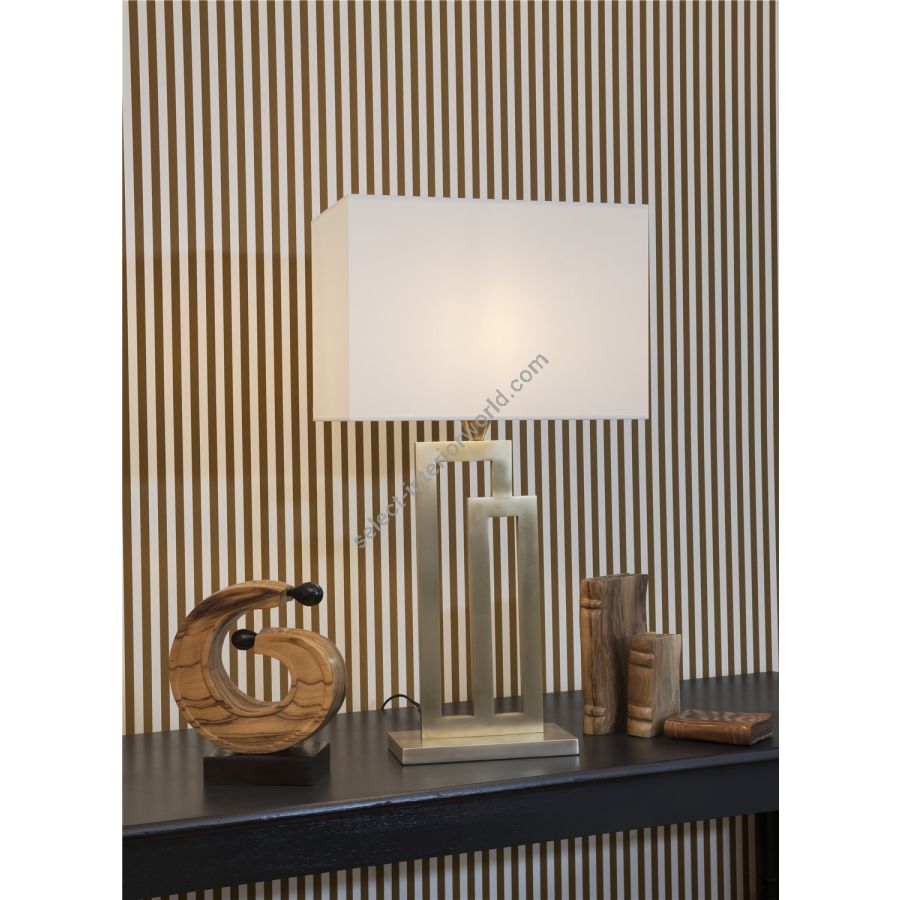 Lamp made in brass. Made with two large rectangular frames, on a square base. This contemporary art deco lamp gives a original design to your interior. Available in black and matt gold patina. Also exists in smaller size (L210A). Presented lamp shade in white cotton chintz in a rectangular shape (see other available colours)