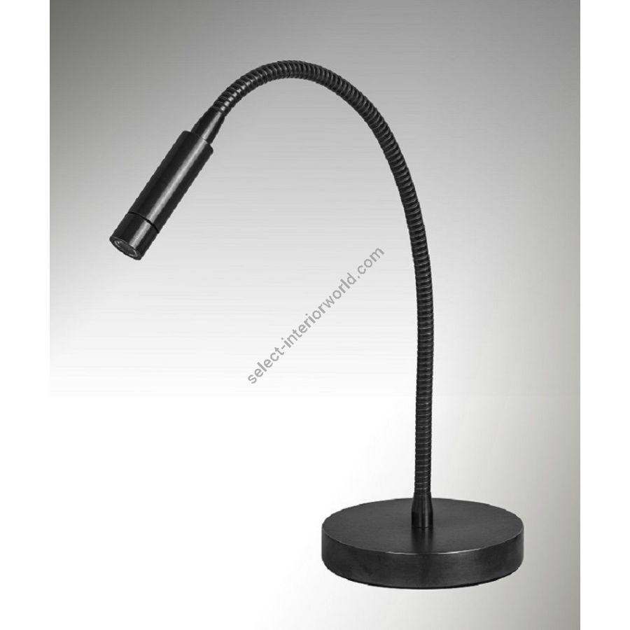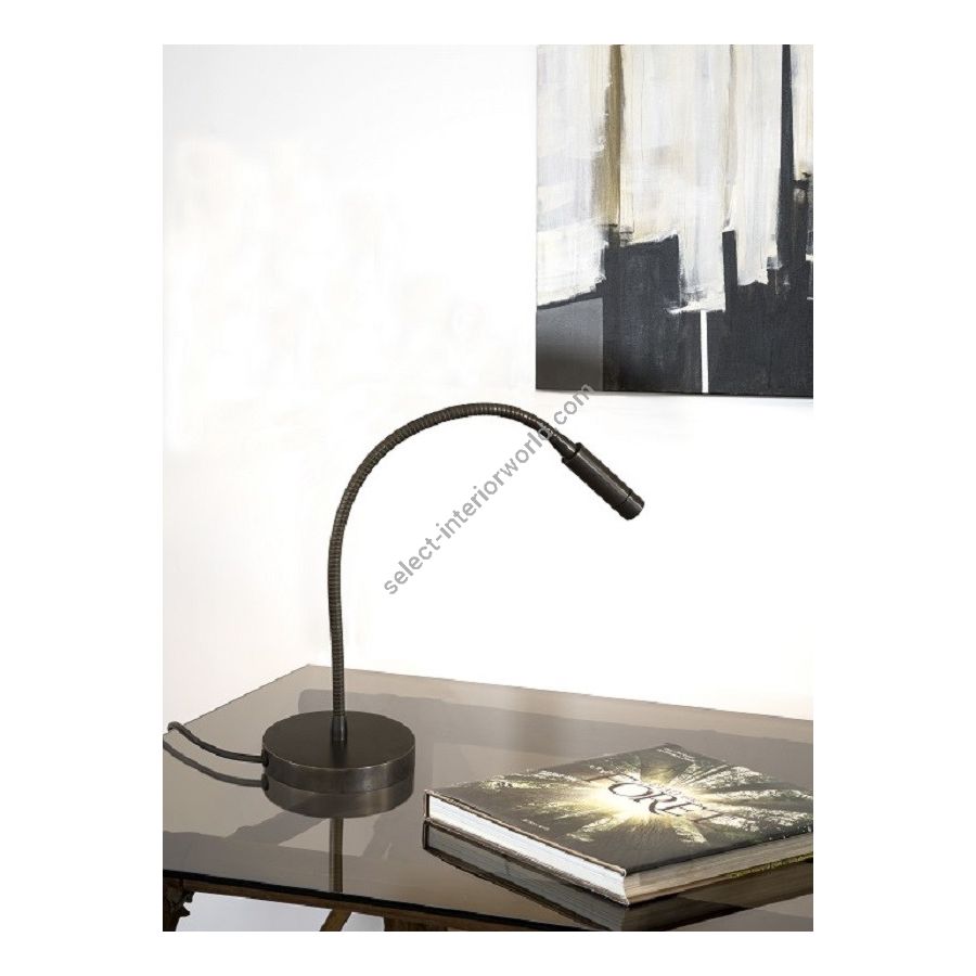 Led table lamp in brass. It is made with a 40cm flex with a led light on a round base. This reading lamp offers a sober and elegant design, and a direct and efficient light for an office table. Available in black or matt gold patina