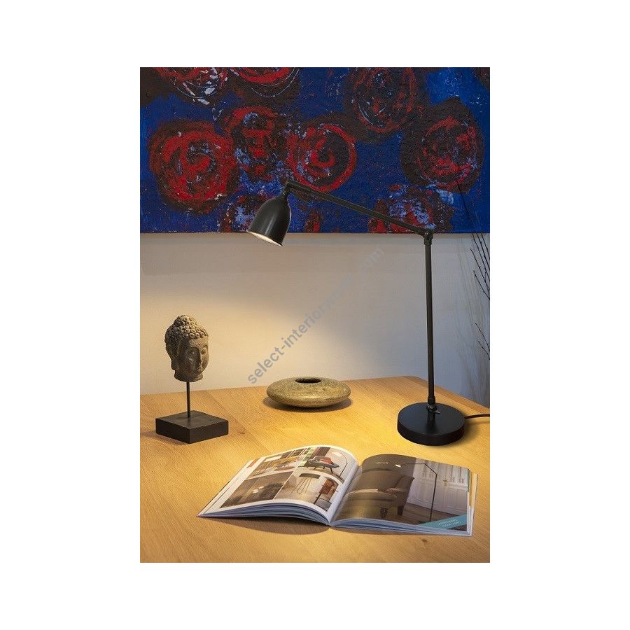 Table lamp in brass. Made with a round tube with a double pivoting arm on a round base, with a pivoting reflector. This elegant table reading lamp gives an efficient direct lighting. Available in black or bicolor (black and matt gold) patina