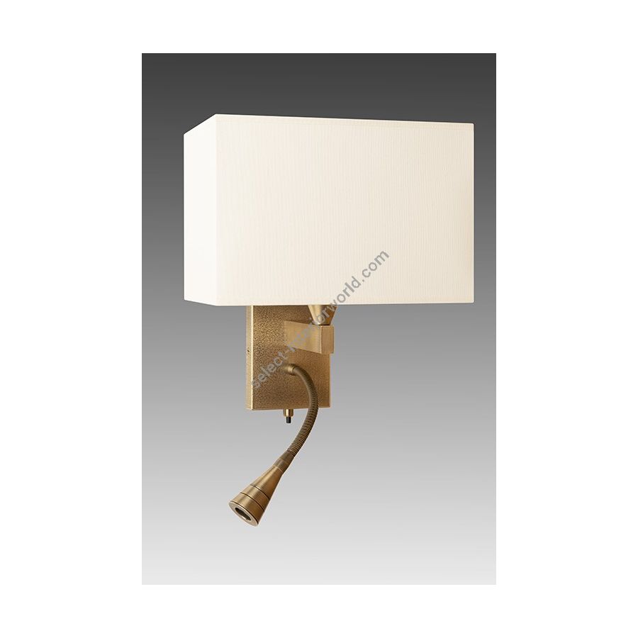 Wall light with Led light made in brass. Made with a fixed arm on a small rectangular base and a Led light, on a 20cm flex with switch. This elegant wall light gives an ambiance or direct light. Possibility of a second switch on demand. Available in black or matt gold patina, and in nickel or brushed nickel. Presented lamp shade in white cotton chintz in a rectangular shape (see other available shapes and colours)