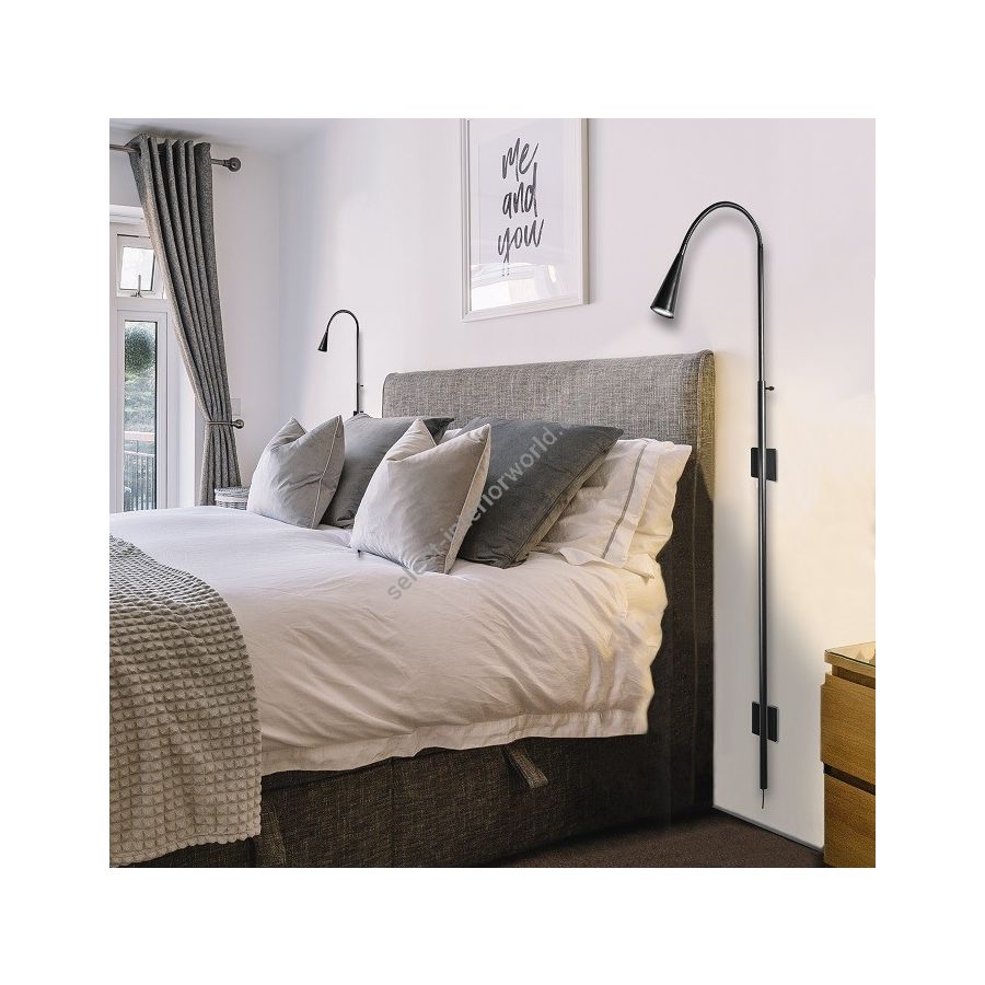 Long wall light made in brass It is made with a telescopic round tube with a cone on a flex, and fixed with 2 square bases This original wall light gives a nice light as a wall head Available in black or matt gold patina