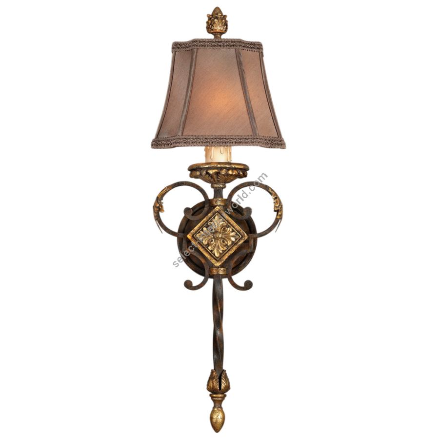 Wall sconce in antiqued finish. Features hand sewn silk shade with braided trim.