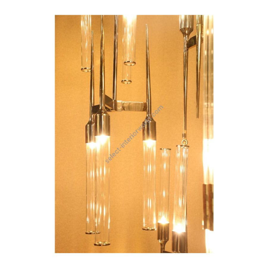 This handmade lighting fixture is made of gold-plated brass, the strong lines create an organic movement of subtle brass tubes complementing the luxury chandelier with clear glass. If you look closely enough, the extended tubes remind dangling stalactite and stalagmite shapes. Hammered by the hands of experienced craftsmen, it is capable of transforming the living space into grand adventurous scenery. This finest lighting design is a beautiful addition to complement the hotel lobby, large hallways, long staircases, or the spacious living room.