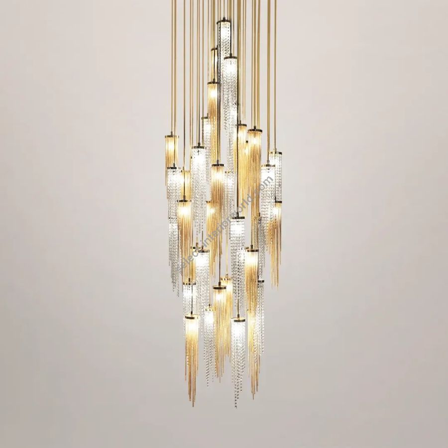 Every crystal is crafted to catch and scatter light in ever-shifting patterns, conjuring the luminous pulse of a city at golden hour. The suspension's elongated silhouette commands vertical space with authority, turning a light fixture into a statement of height, movement, and refined drama.