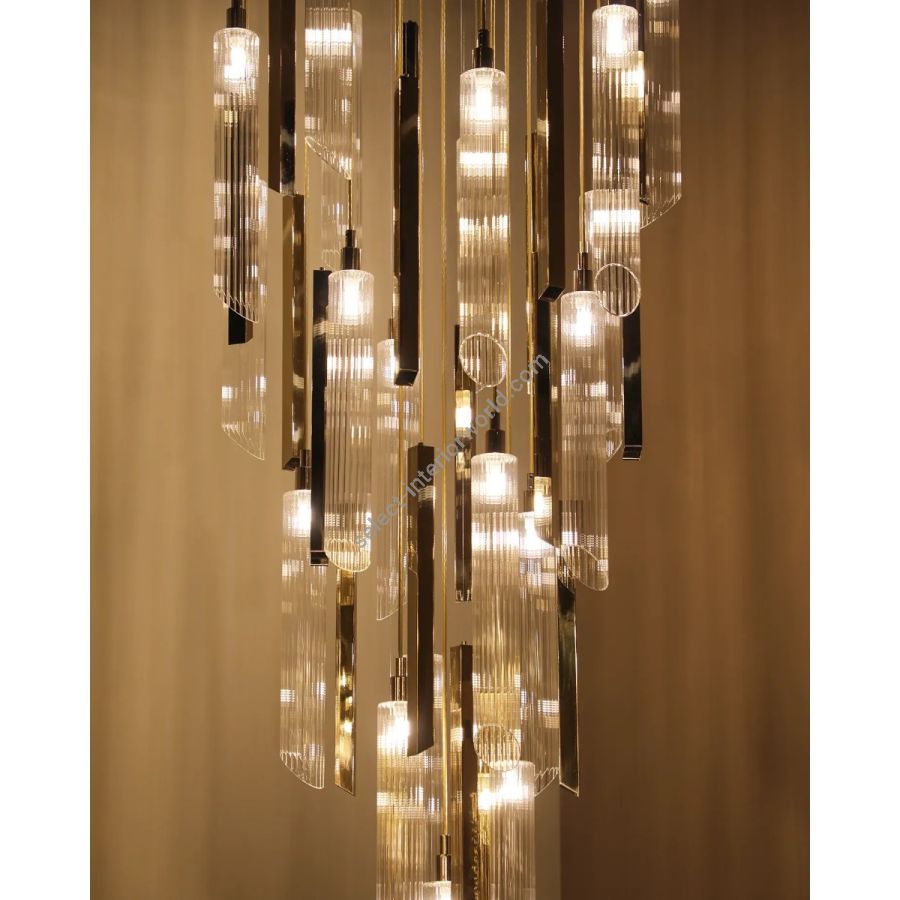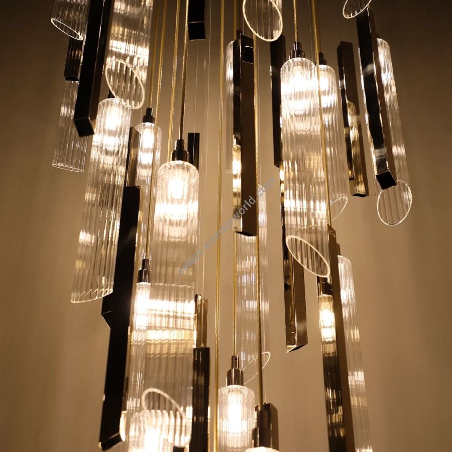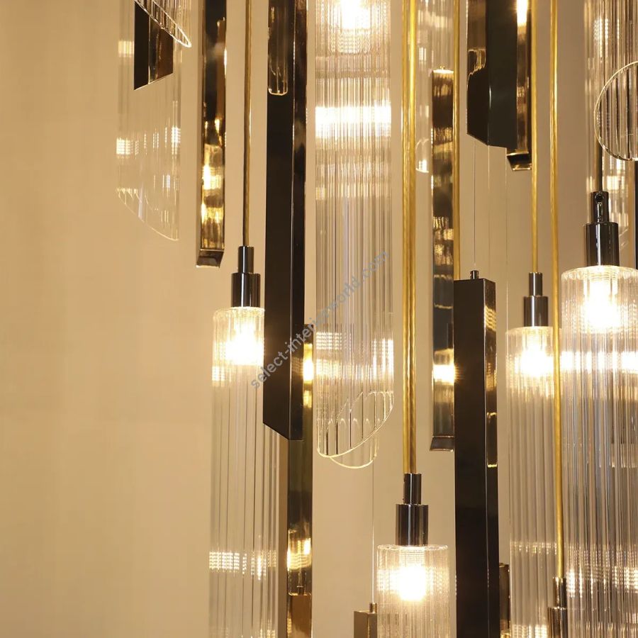 Each pendant is individually crafted — some in warm, polished brass that catches the light with a golden depth, others in refined translucent glass that diffuses it into something softer and more ethereal. Together, they create a layered visual rhythm that is at once dynamic and serene.