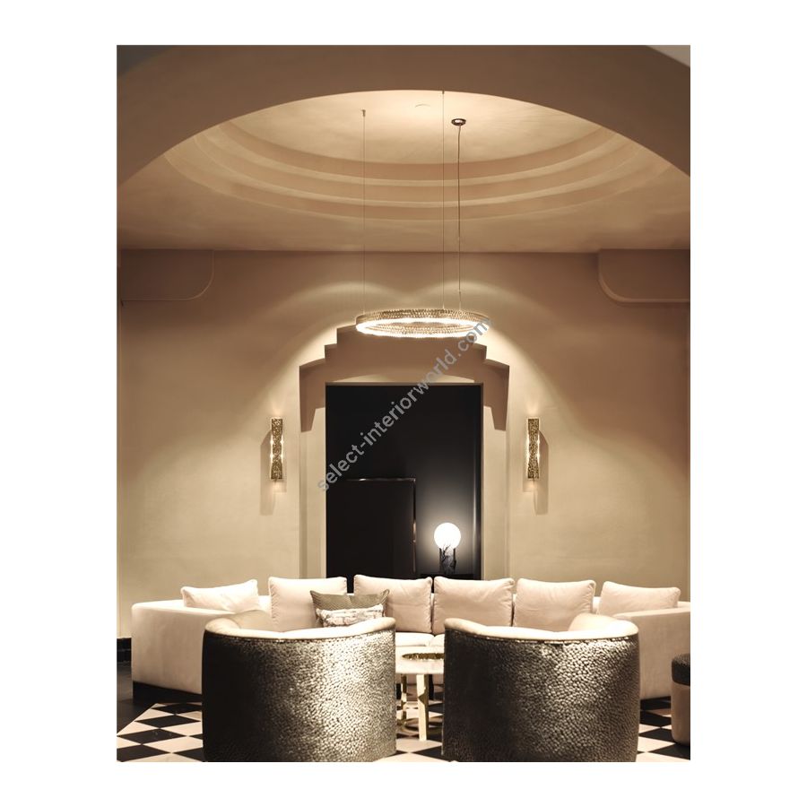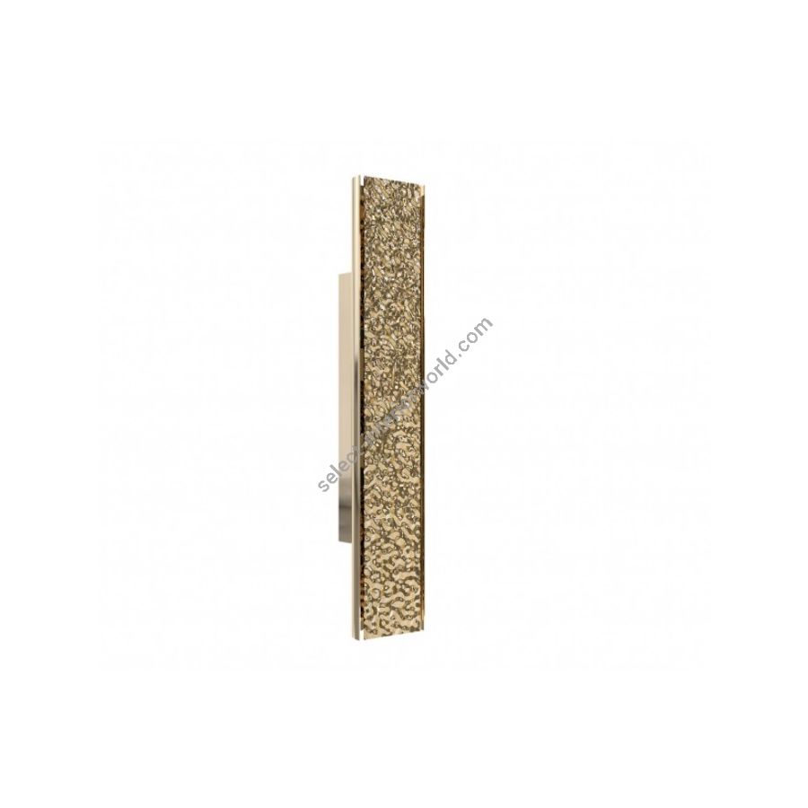 Composed of a rectangular shaped gold-plated brass plate - hammered by hand with modern handcraft technics – placed in the center of a semi-circle that allows a warm light to spread through the slight space in between this wall light design.