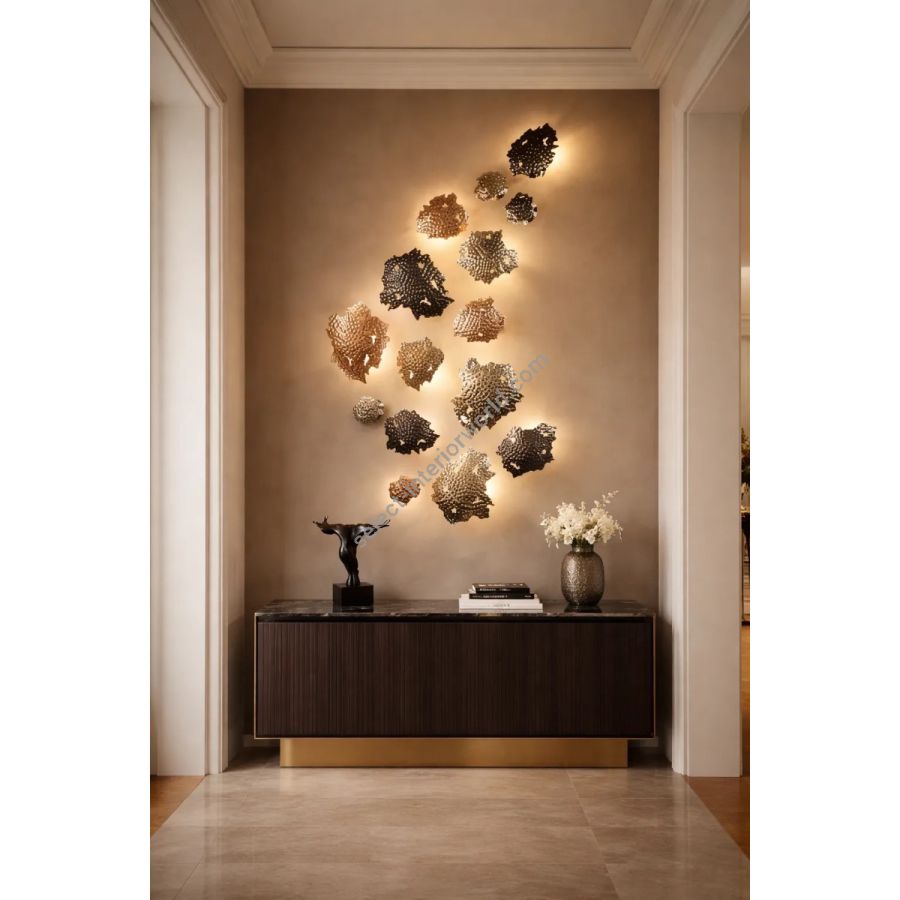 The richly textured brass surface interacts beautifully with light, revealing warm reflections and subtle highlights that shift with the viewer’s perspective. When illuminated, the sculptural silhouette casts a soft, ambient glow, creating a captivating interplay of light and shadow across the wall.
