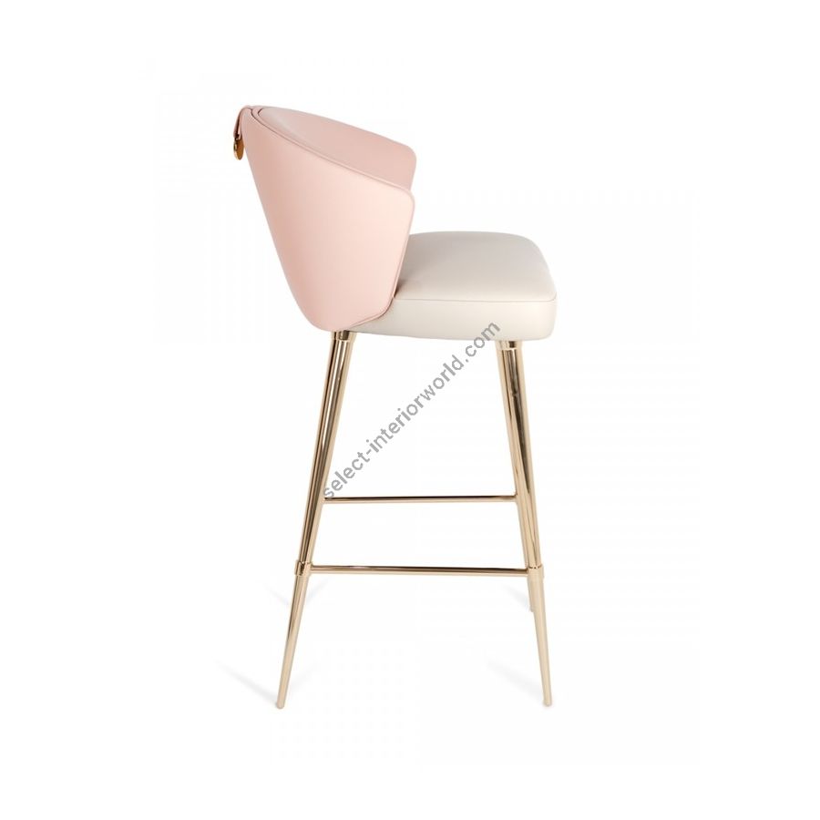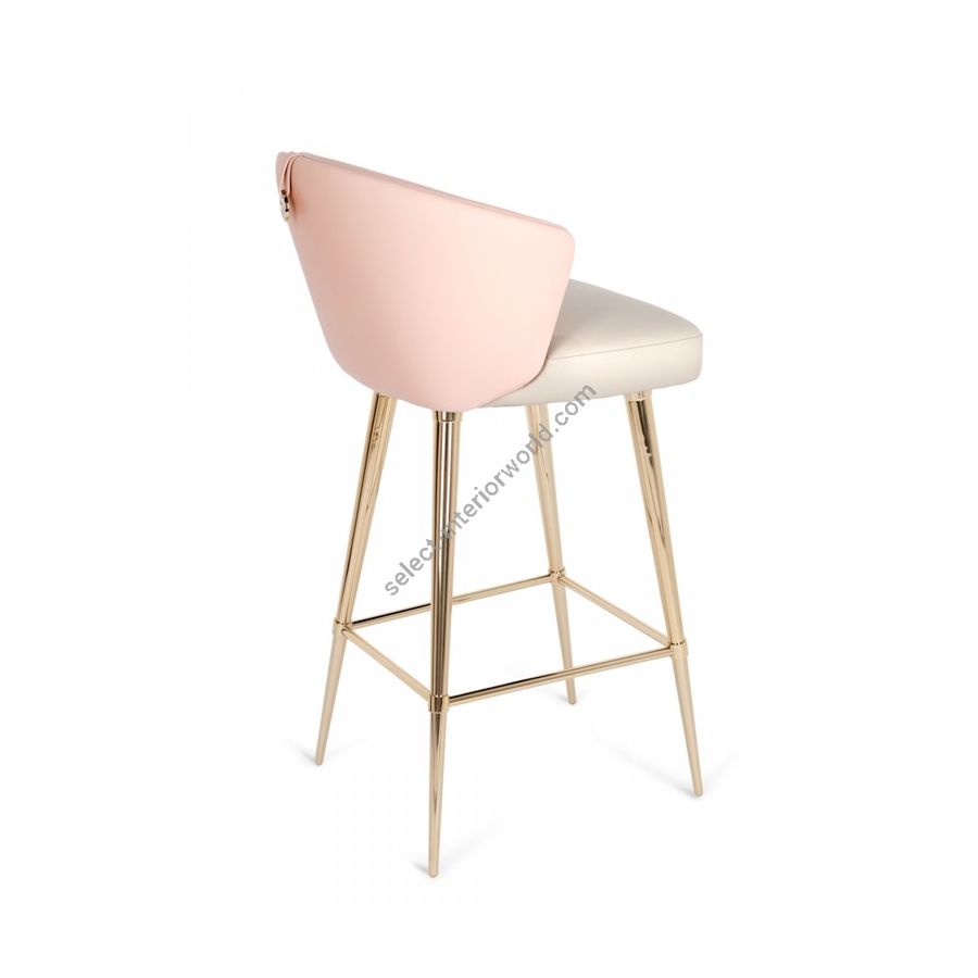 The luxurious, timeless glimpse of this handmade bar chair, provided by a refined combination of materials such as brass and leather, framing the mesmerizing upholstery with a pinch of finesse aesthetics. This chair design can be fully customized using Castro range of fabric choices. Any other fabric design can be added, making it unique for any exclusive interior design project.