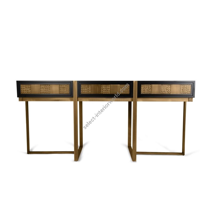 Piet Mondrian is recognized for the purity of his abstractions as he radically simplified the elements of his paintings to reflect what he saw as the spiritual order, creating an aesthetic language. Inspired by this painter’s unique artwork, Mondrian console is composed by several pieces with geometrical squared shapes, just as the artist used to do in his work. This unique bespoke decorative piece combines two different finishes – brushed and hammered – applied by hand in the gold plated brass.