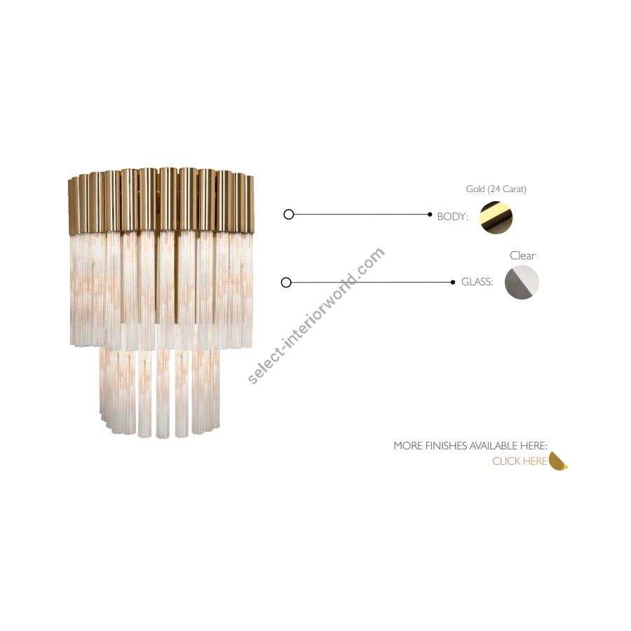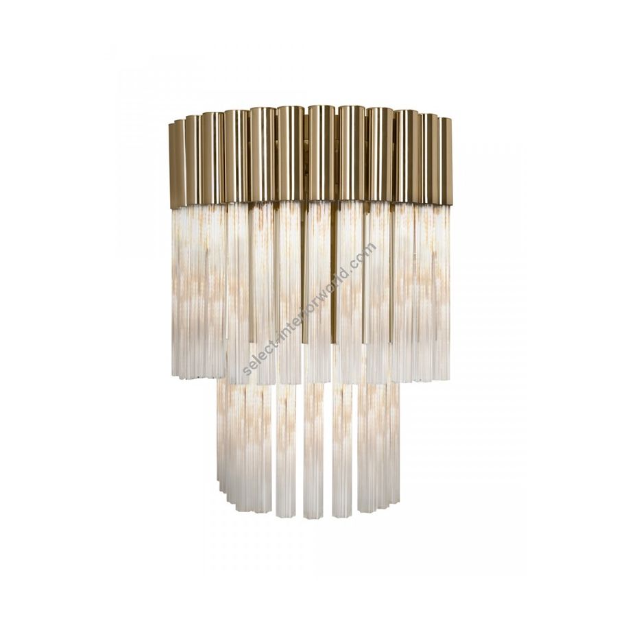 Gold-plated brass, masterfully combined with mesmerizing glass, provides an aerial atmosphere, full of bright and playful shooting amber rays of light. This opulent lighting sconce brings sensuality and a state of tender contemplative attitude and openness. A soft light that transmits class and purity to every space. It is a perfect match to different type of interiors: either classic, or modern.