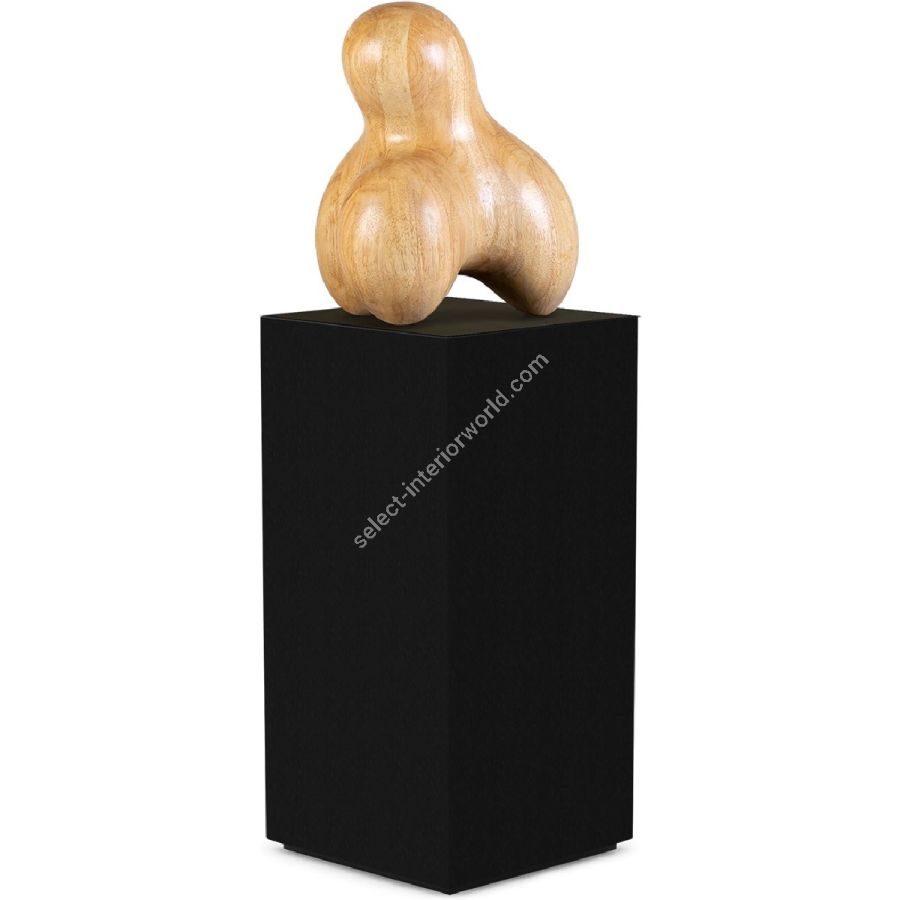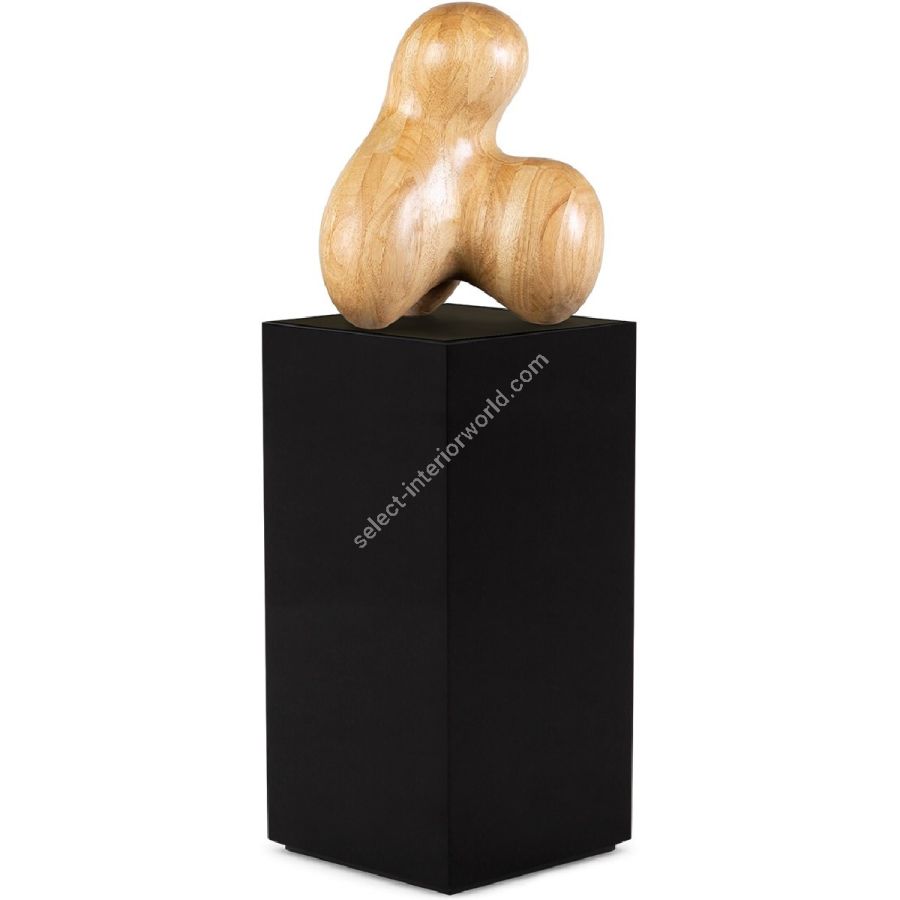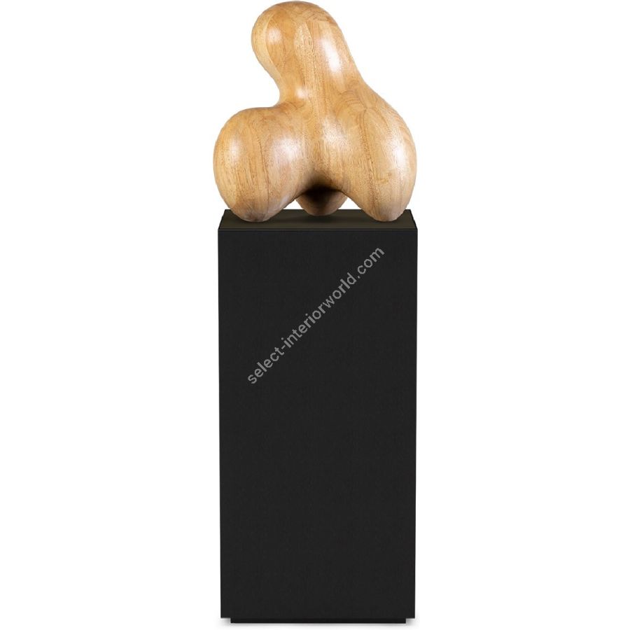 A beautifully handcrafted abstract natural wood sculpture displayed on an elegant black wood pedestal.
